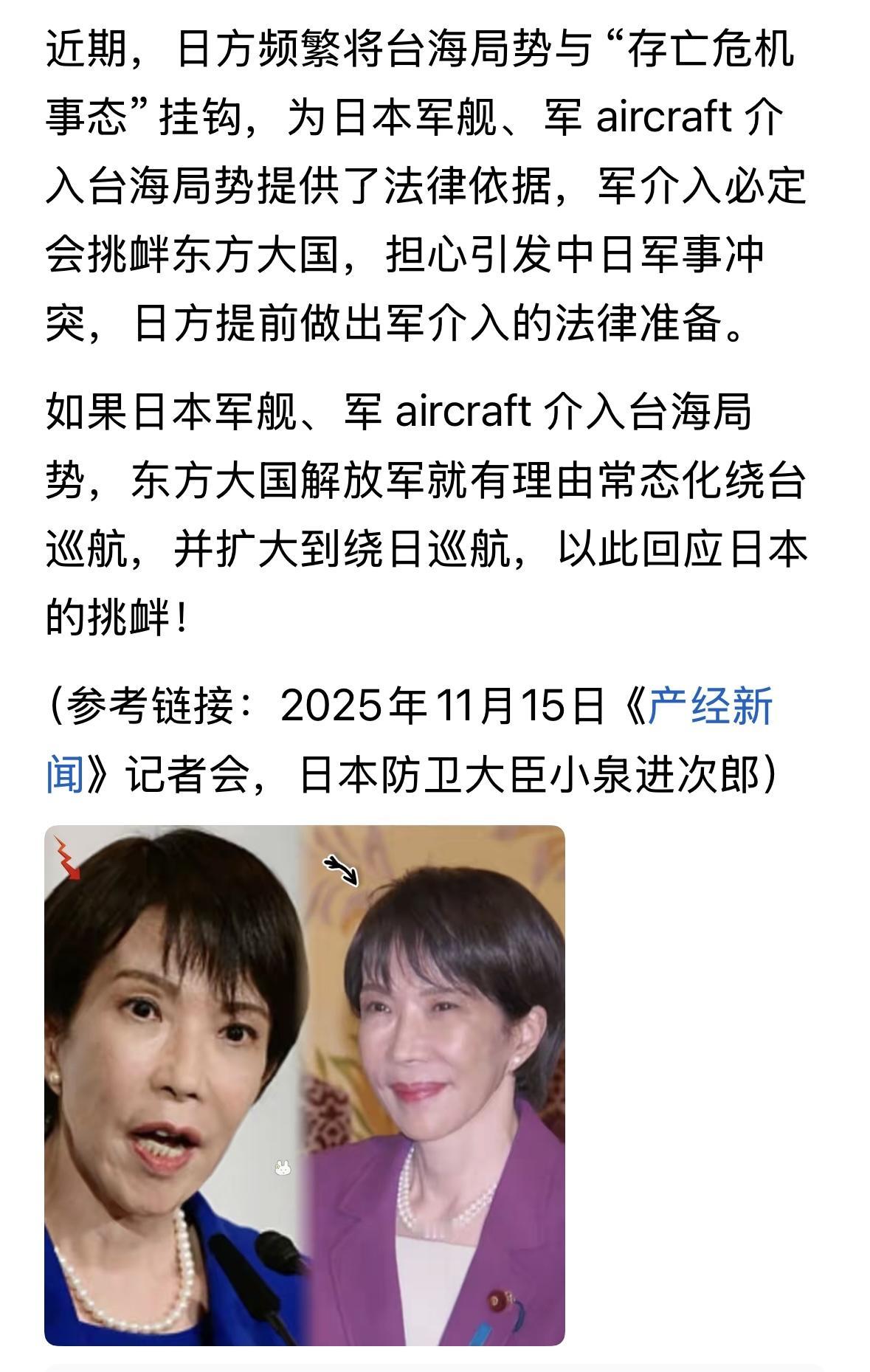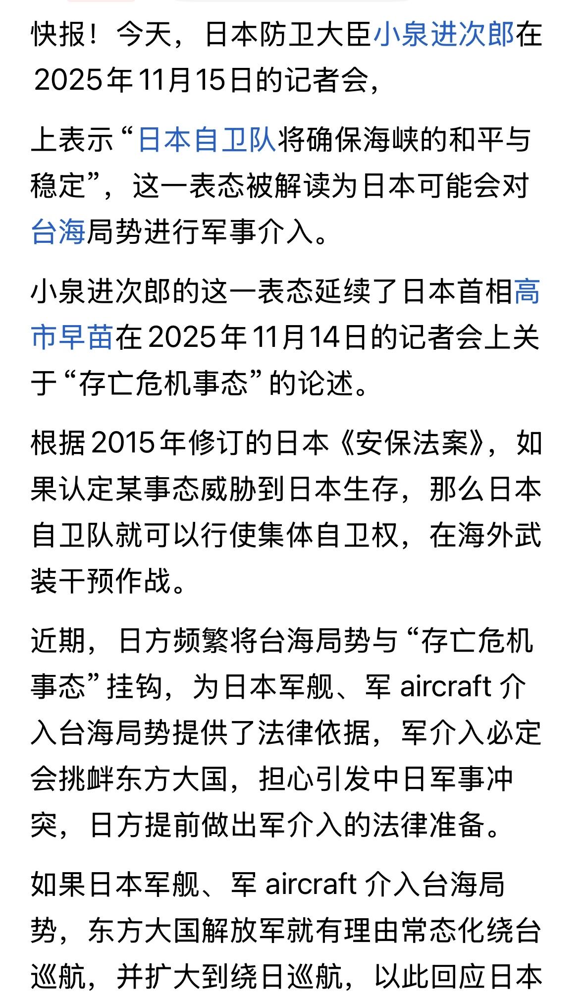 今天日本防务大臣发表类似高市早苗到涉台言论,做实了高市早苗得言论不是一时兴起,也不是个人行为,实实在在的就是日本国家的观点和预案,应该也有美国的影子,或者也可能跟美国商量过。我们强烈批判,坚决反对,实质性反制,肯定也是分析透了日本的这种阴谋诡计。