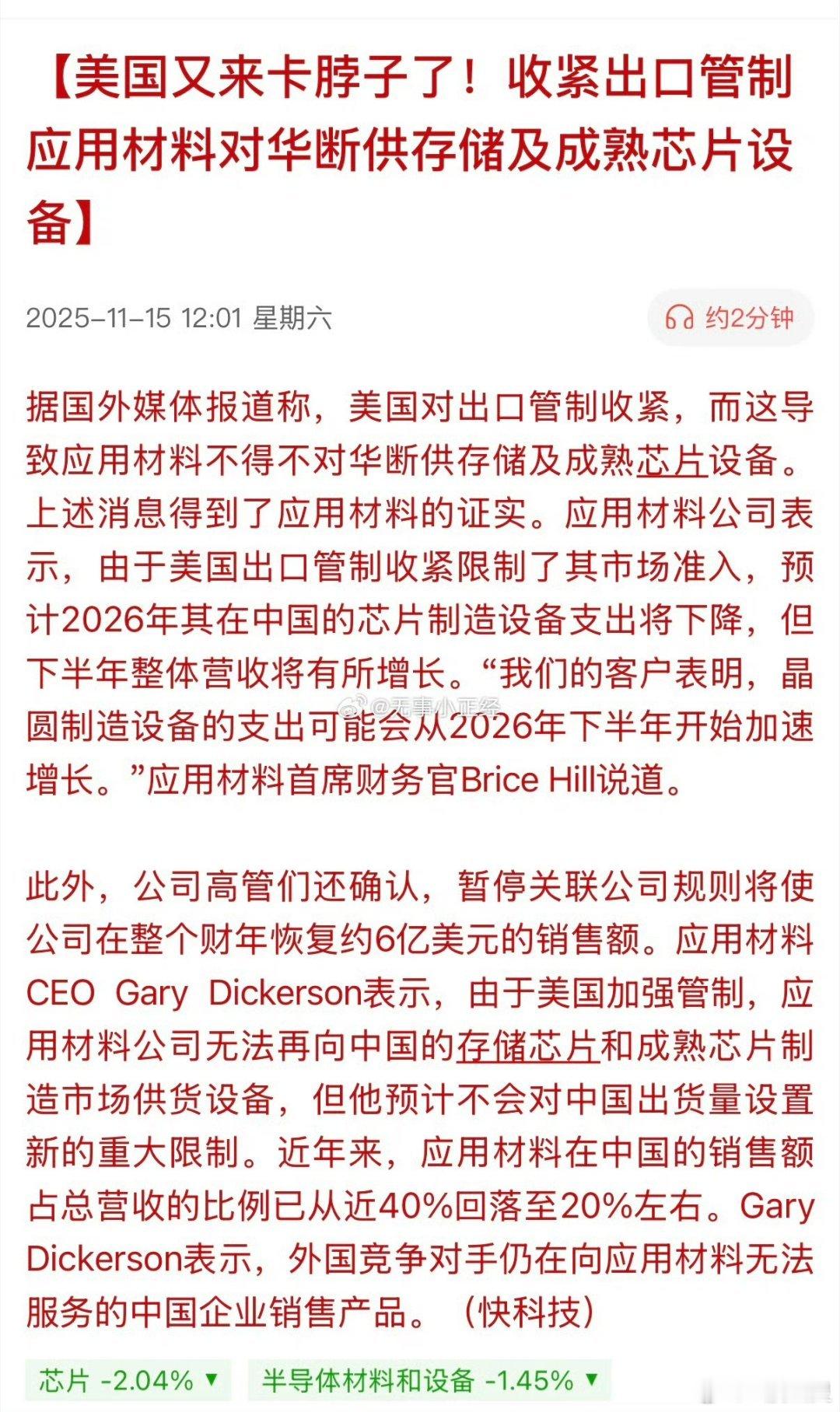 又来卡脖子了美国出尔反尔毫无诚信,又找事了:美设备巨头对华断供存储及成熟芯片设备。——西方的契约还不如厕纸。所以,核心技术一定要掌握在自己手里。大科技还得继续加强。