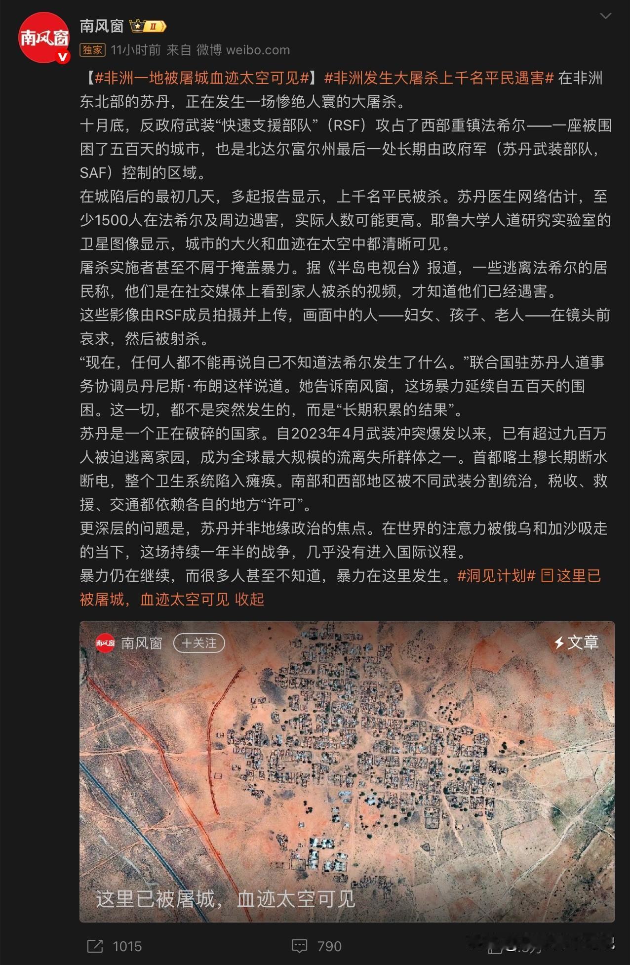 我严重怀疑现在不是2025年,居然在非洲还发生了屠城事件,屠杀点血迹在太空都能看见。在苏丹西部重镇法希尔被攻陷后,发生了惨绝人寰的大屠杀。多起报告显示,在最初的几天里有至少1500平民被杀害。屠杀地被血液浸染变成了暗红色,在太空卫星的镜头下清晰可见。这种情形绝对是震撼全球的,令人发指的。那些将屠刀对准贫民的人其实就是懦夫,一定不会有好下场!