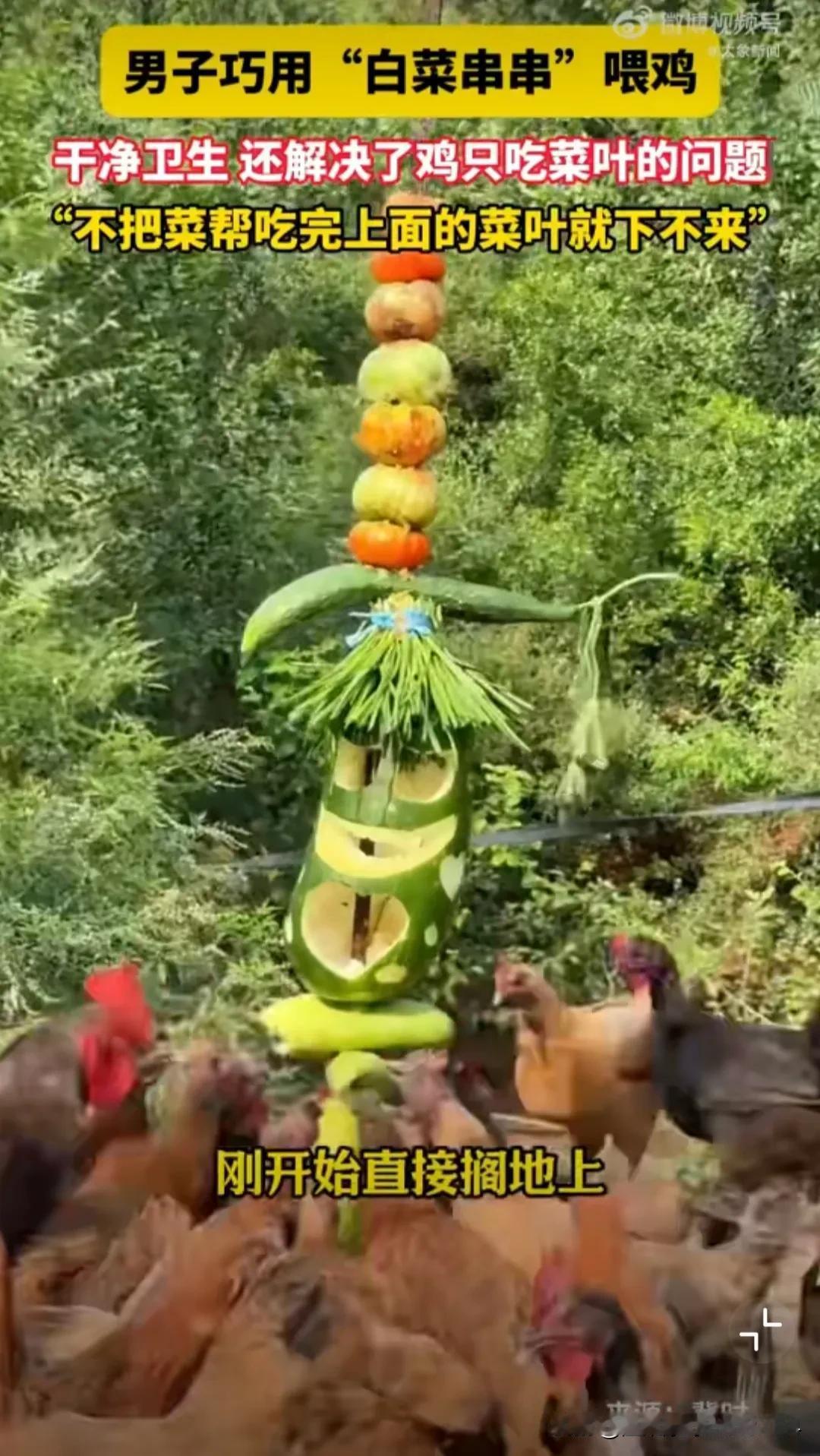 养过宠物的应该都知道,在喂养小动物时,它们总会剩一些不喜欢吃的,搞得到处都是。而北京一小伙,只用了一招就把散养的1500只鸡治的服服帖帖,网友:好聪明啊,这样的鸡脖应该更好吃吧! 聪明的小伙用一根铁棍把蔬菜都串起来,制成“串串香”,这样这些鸡只有把下面的菜都吃干净了,上面的菜才会掉下来。而且在争抢下,一些散落的碎菜也很快被弱小的鸡吃掉,这样既保证了干净卫生,又很好地锻炼了鸡仔! 小伙散养这么多鸡不容易啊!也真应了那句话,只要思想不滑坡,办法总比困难多!