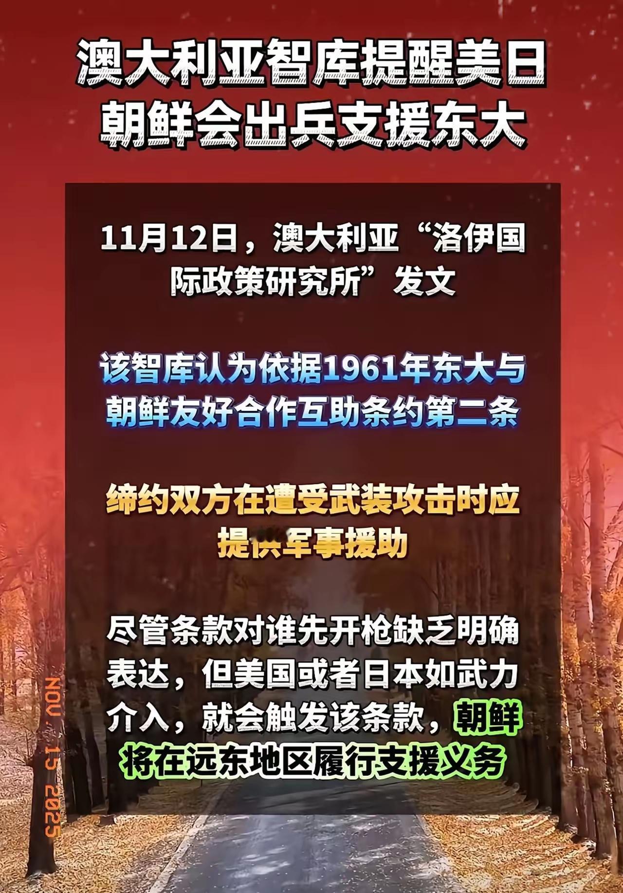 朝鲜!!! 这份情,中国14亿人民记下了 澳智库发声:日本若武力介入台海,朝鲜将依中朝条约参战支援中国! 朝鲜已经明确表态,一旦东方大国与日本开战,就会支持东方大国,像之前援助俄罗斯一样出兵对抗日本。 中朝友好合作互助条约可不是空话,1961年生效至今始终有效,条约里写得明明白白,一方遭攻击另一方必全力支援,这是实打实的硬承诺。 抗美援朝的硝烟虽已散去,但中朝军民并肩抗敌、用鲜血铸就的情谊,几十年里从没变过,这种生死之交,比金坚比石硬。 澳国立大学国际战略研究所的这份报告,可不是随口杜撰,他们跟踪东北亚局势多年,分析数据详实,结论才有这么强的说服力。 日本近期的小动作越来越出格,政客频繁窜访台湾,自卫队和美军密集军演,还喊出“台海有事即日本有事”,完全踩在红线之上。 朝鲜向来言出必行,之前俄罗斯特别军事行动,它很快送去急需的物资和医疗援助,不玩虚的、不打折扣,这份仗义在国际上少见。 看看有些国家,遇事要么含糊其辞,要么隔岸观火,唯有朝鲜,在关键时刻挺身而出,坚定站在中国这边,这份情太让人暖心。 台海是中国核心利益中的核心,纯属内政,任何外部势力插手都师出无名,日本敢动武,就是同时挑衅中朝两国,后果不堪设想。 14亿中国人为啥记着这份情?因为在被别有用心的国家围堵时,有人愿意不计得失伸援手,这种纯粹的友谊,比任何外交辞令都珍贵。 日本别以为有美国撑腰就肆无忌惮,中朝联手的力量,从历史到现在都不容小觑,真要撕破脸,最后吃亏的肯定是它自己。 中朝条约从不是威胁谁,而是维护地区和平的压舱石,谁想破坏台海稳定,就得先掂量这两份沉甸甸的承诺有多重。 朝鲜的表态,既是支持中国,也是反击霸权主义,告诉世界正义不会缺席,谁想欺负人、搞分裂,总得付出代价。 咱们中国向来爱好和平,但从不惧怕战争,若有人敢把战火引到台海,我们有决心也有能力捍卫主权,再加上朝鲜支援,底气更足。 这份跨越国界的友谊,经得住风雨考验,14亿中国人记在心里,也会用实际行动回馈这份信任与支持。 日本该回头看看历史,当年的教训还不够深刻吗?妄图干涉他国内政、介入台海,最终只会引火烧身、自食恶果。 国际社会都看在眼里,谁是和平维护者、谁是稳定破坏者,一目了然,朝鲜的仗义执言,赢得了更多正义力量的认可。 那些觉得朝鲜只是口头支持的人可以醒醒了,它向来说到做到,援助俄罗斯的行动就是证明,真到关键时刻绝不会掉链子。 中朝两国心往一处想、劲往一处使,就是要告诉那些别有用心的国家:想在台海搞事情,门儿都没有! 这份深情厚谊,藏在条约里、刻在历史中、体现在行动上,中国14亿人民永远不会忘,也永远会珍惜。 各位读者你们怎么看?欢迎在评论区讨论。
