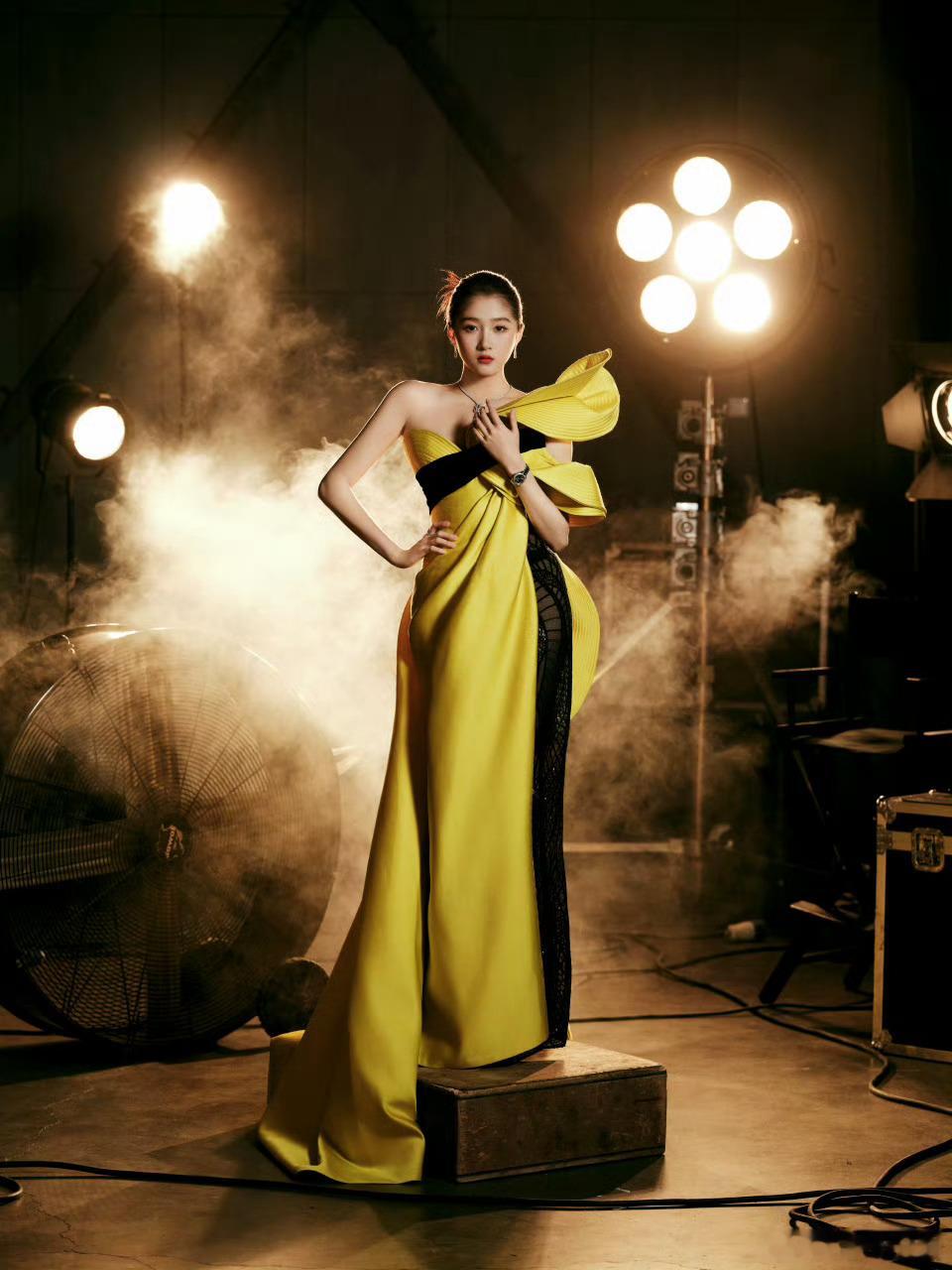 关晓彤 今日 造型, 一袭Georges Chakra 25秋冬定制系列,亮黄主色裙身黑色缎带点缀,立体褶皱、飘逸袖口… 漂亮的肩颈线条,明媚优雅的身姿,大气而不失高贵气质。💛🧡💛