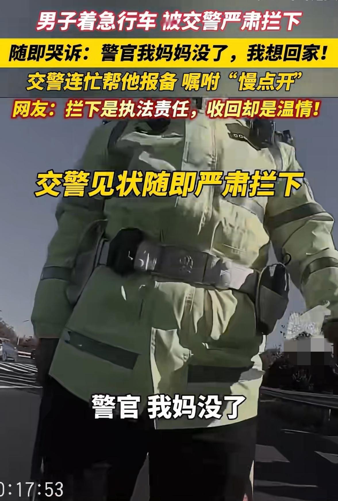 男子奔丧被交警拦下 当男子哭着说出“我妈没了, 我不是想超车”,交警立刻 道歉并放行“您节哀,不好意思耽误您了, 慢点走” 交警拦下男子是法律法规,放行是人情, 当执法者有了温度,人间便充满真情。 交警的放行,是对男子孝心最大的尊重。 为交警人性化的执法点赞,交警的行为 再一次诠释了“规则是用来保护人的, 而不是用来为难人的”。 其实生活里,类似这种规则与温情碰撞的瞬间不少。它让我们明白,冰冷规则下,人心的柔软与善良,能让世界变得更美好。要是你碰到这事儿,会咋做呢?快在评论区唠唠。