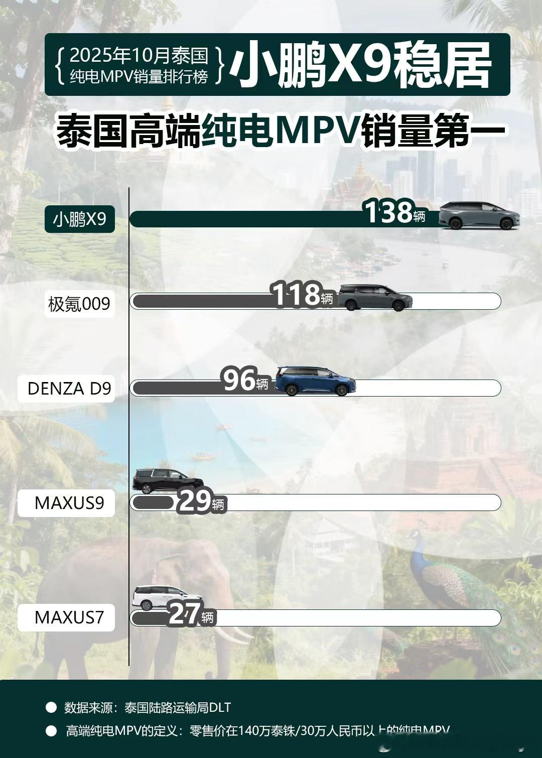 小鹏X9十月再登泰国纯电MPV销量榜首!根据泰国陆路运输局DLT车辆上牌数据显示,继荣登泰国第三季度纯电MPV上牌量榜首后,小鹏X9在10月再次站上榜首。