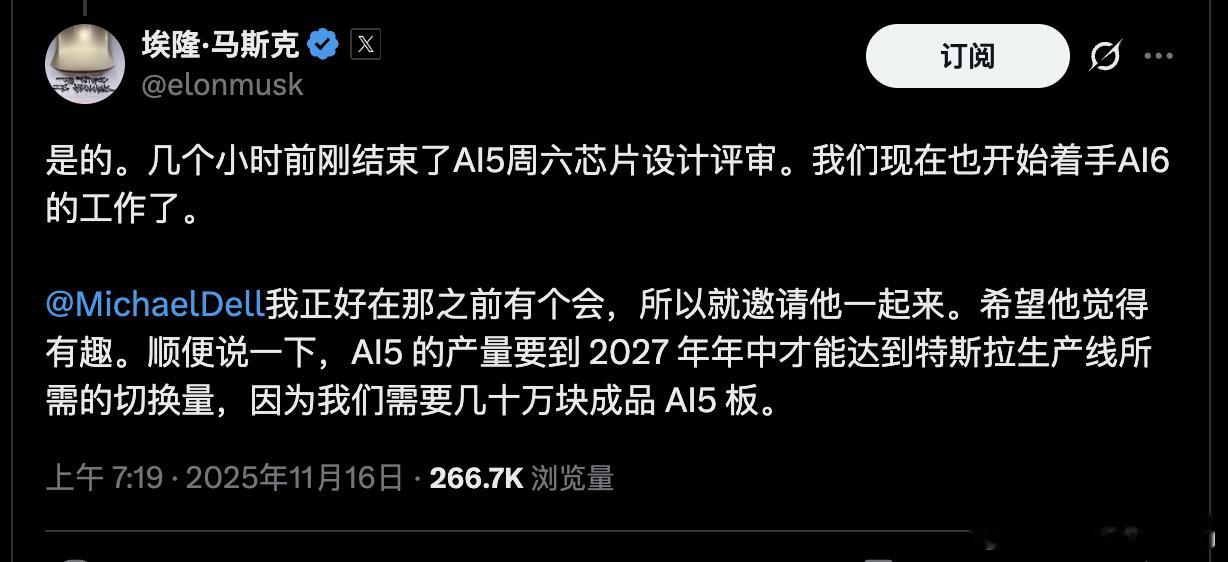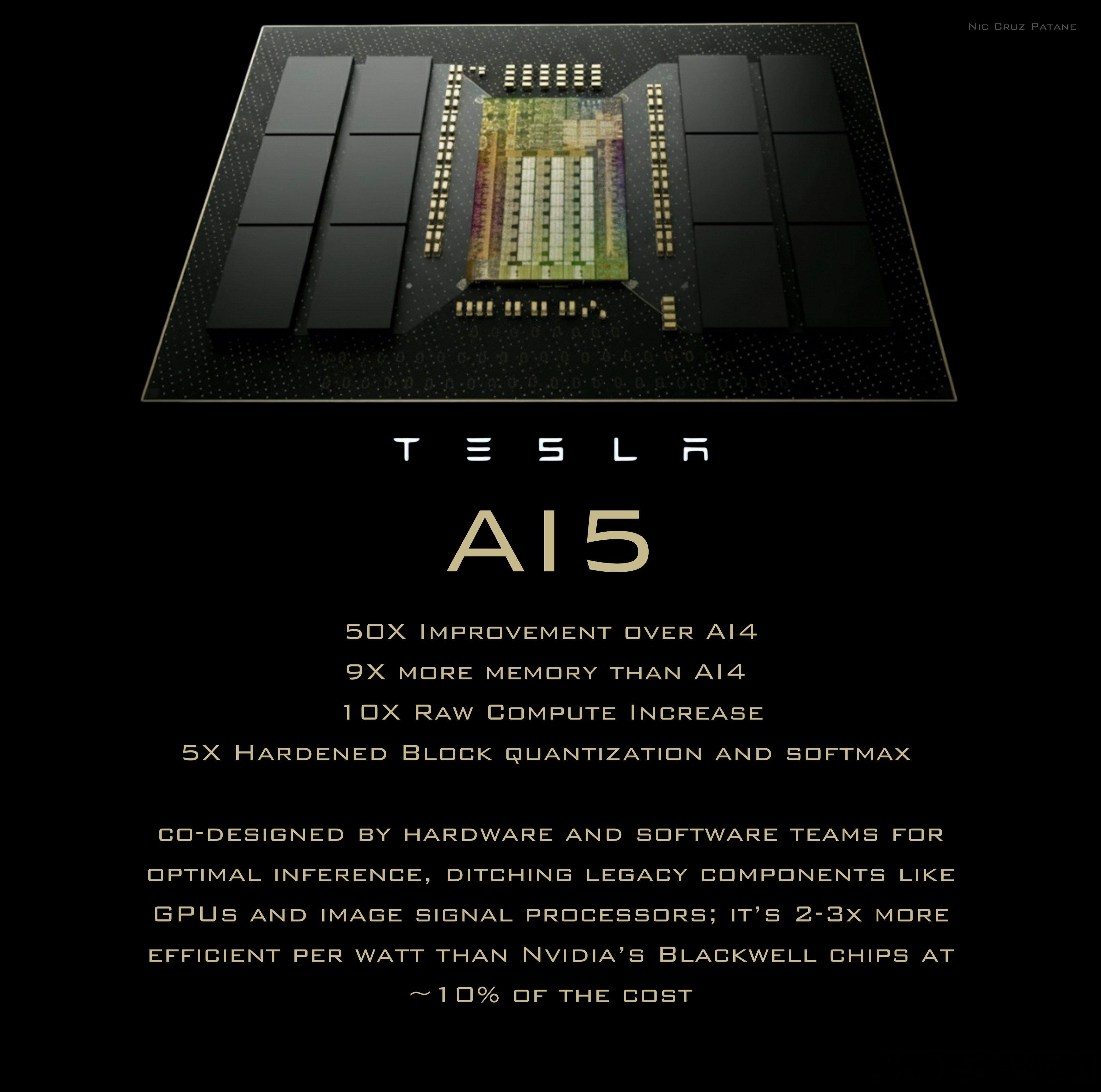 老马:AI5芯片预计27年中上车特斯拉,AI6芯片设计评审结束图二:相比AI4提升50倍;比AI4多出9倍内存;10倍原始计算能力提升;与NVIDIA的Blackwell芯片相比,其每瓦特效率高出2-3倍,且成本约为后者的10%