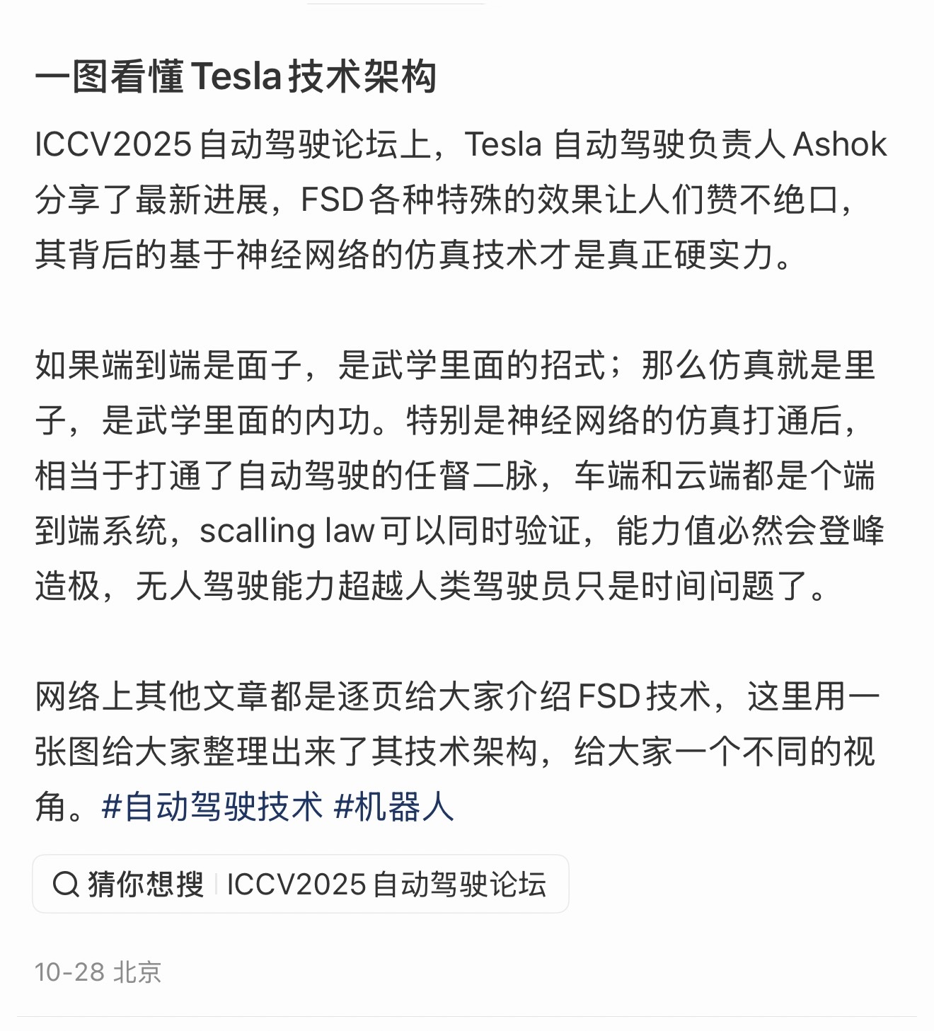 小康一早转了这张图,各群就传起来了。这是10月28号夏中谱解读特斯拉Ashok ICCV演讲的分享。他还回答了几个自己理解的关键问题。