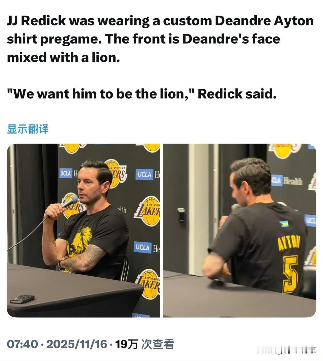 艾顿真吃这一套啊! 今天,客场作战的湖人队以119-95大胜雄鹿队,取得两连胜。本场比赛,主力中锋艾顿再度打出了出色的表现,在与字母哥、特纳的对位中得到了20分10篮板2抢断的两双数据,成功捍卫了球队的内线。 艾顿背靠背作战的持续强硬离不开雷迪克的鼓励。赛前,雷迪克身穿一件印有艾顿与雄狮合体图像的照片接受采访,他表示相信艾顿能像雄狮一样打球。果不其然艾顿就吃这一套,在今天的比赛中打得非常强硬,这就是雷迪克和教练组想要看到的艾顿!