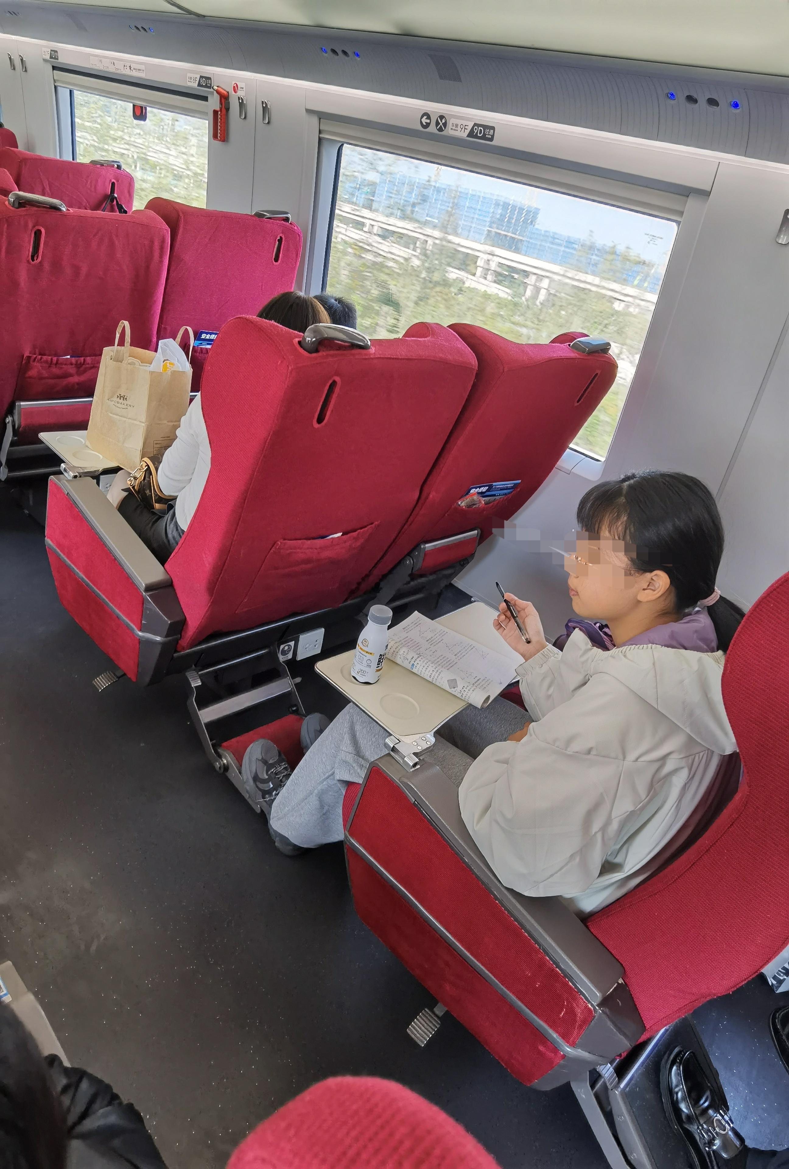 秋假要过,作业要做。高铁上还在奋笔疾书的孩子。