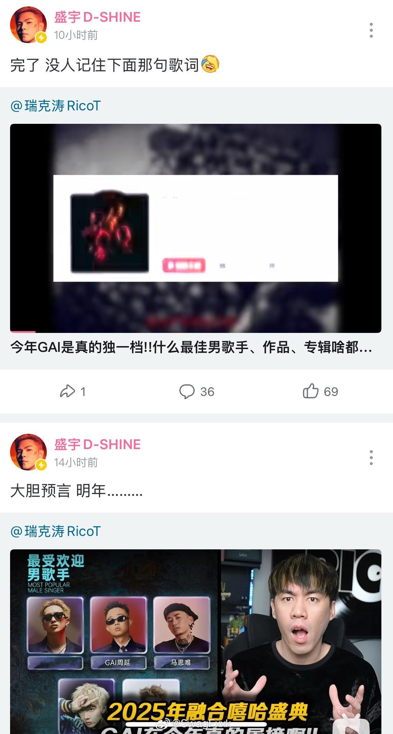 盛宇再度转发瑞克涛投票视频,表示:完了没人记住下面那句歌词。而完整歌词是:大胆预言 明年top3金曲它还是我的!