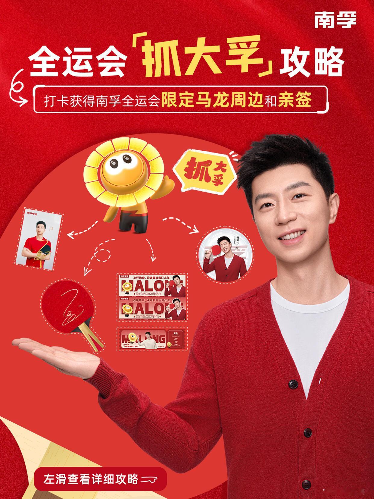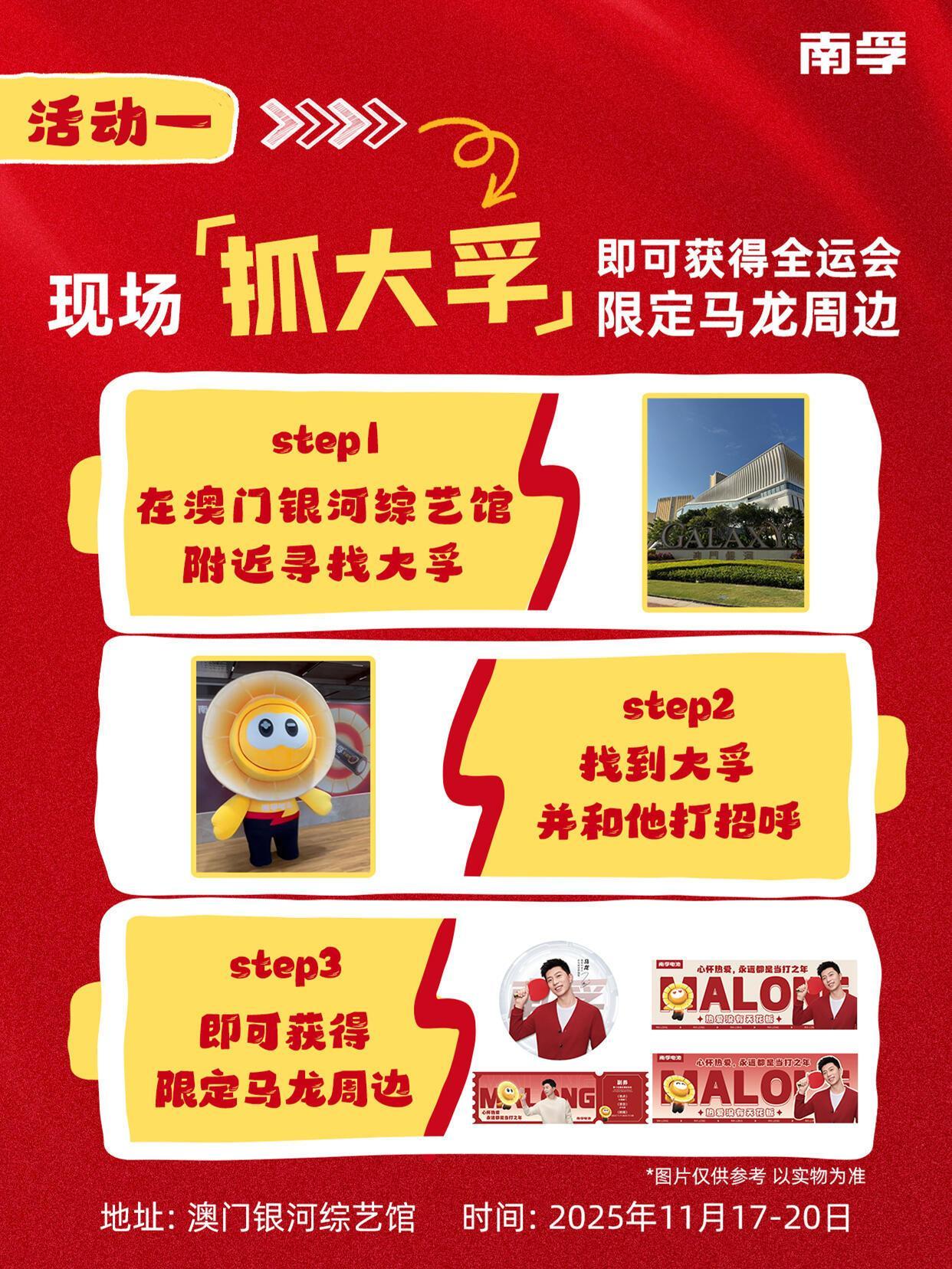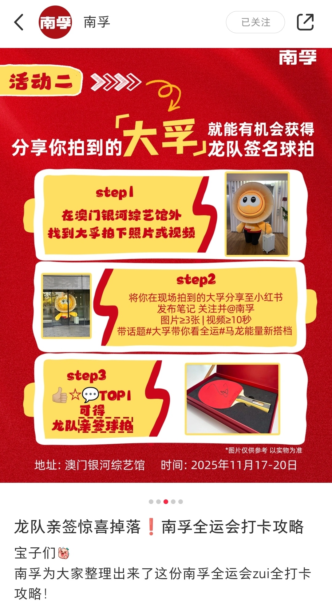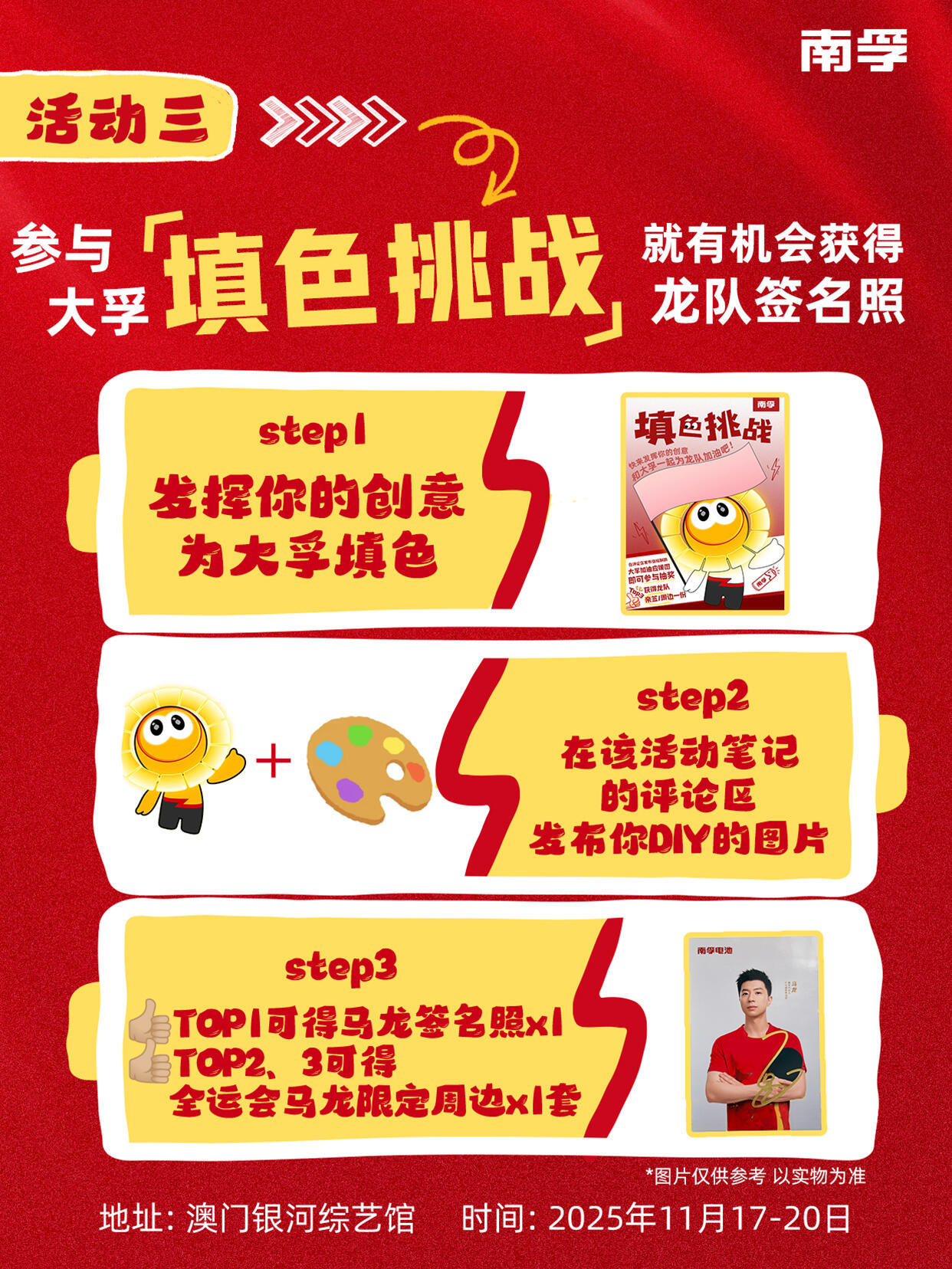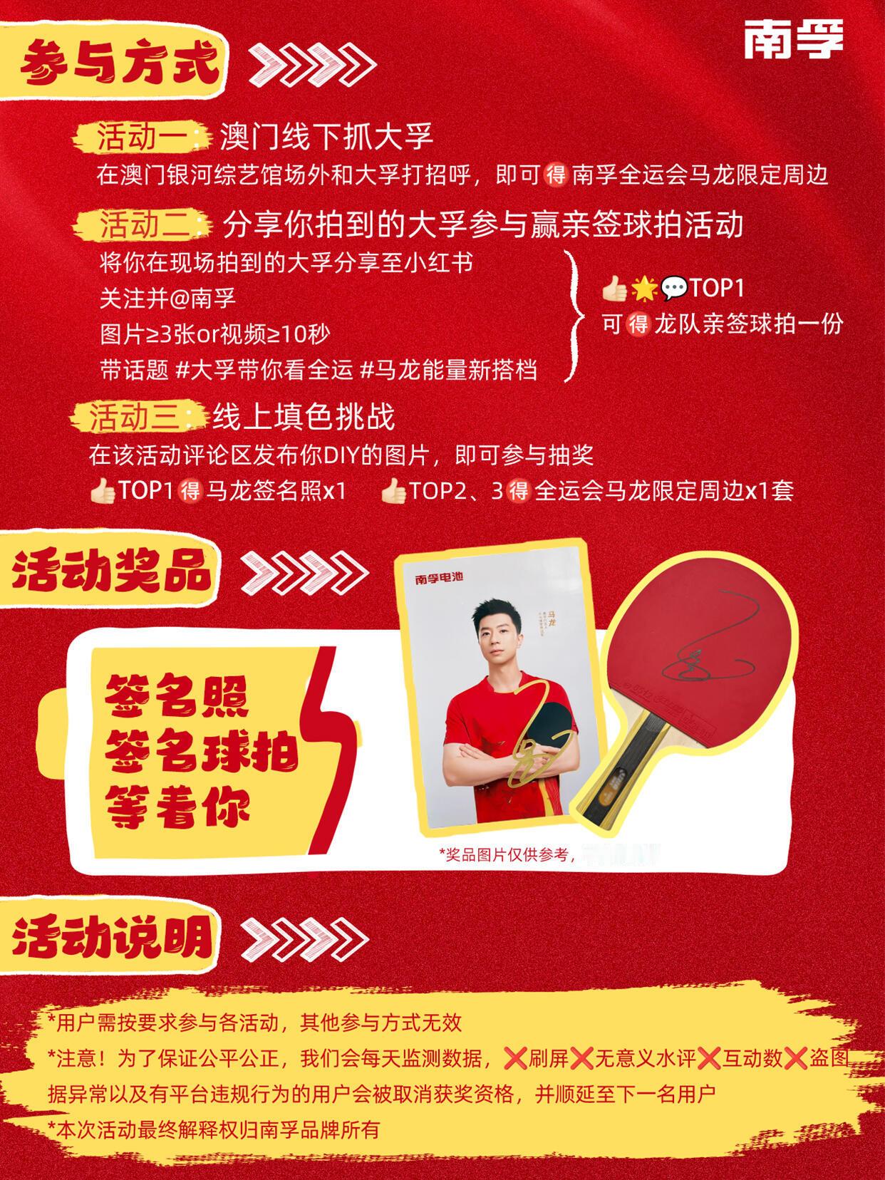 南孚澳门活动👉龙队亲签惊喜掉落❗️南孚全运会打卡攻略宝子们南孚为大家整理出来了这份南孚全运会zui全打卡攻略!速速码起来,有机会🉐龙队亲签哦活动1️⃣🌟澳门线下抓大孚👉🏻在澳门银河综艺馆场外和大孚打招呼🙌🏻🉐南孚全运会马龙限定周边活动2️⃣🌟分享你拍到的大孚参与赢亲签球拍活动👉🏻将你在现场拍到的大孚分享至小红书✅关㊗️并✅图片≥3张or视频≥10秒✅带话题 (详情前往南孚🍠)👍🏻⭐️💬TOP1可🉐龙队亲签球拍一份活动3️⃣🌟线上填色挑战👉🏻在该活动评论区发布你DIY的图片即可参与抽奖👍🏻TOP1🉐马龙签名照x1👍🏻TOP2、3🉐全运会马龙限定周边x1套⚠️活动说明:1️⃣用户需按要求参与各活动,其他参与方式无效2️⃣注意!为了保证公平公正,我们会每天监测数据❌刷屏❌无意义水评❌互动数据异常❌盗图以及有平台违规行为的用户会被取消获奖资格,并顺延至下一名用户3️⃣奖品图片仅供参考,以实物为准4️⃣本次活动最终解释权归南孚品牌所有