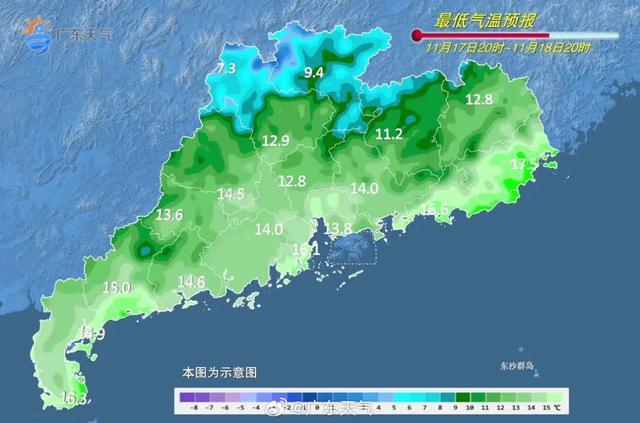 11月18日,广东大部多云转阴天,部分市县有小雨。各地气温明显下降,天气转寒凉,最低气温:粤北和珠三角北部市县8~12℃,南部沿海市县15~18℃,其余市县12~14℃。