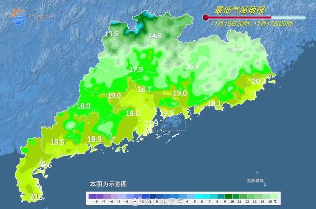 11月19日,粤北市县多云到阴天,局部有小雨,中南部市县阴天,有小雨。气温维持在较低状态,天气寒凉,最低气温:粤北和珠三角北部市县6~9℃,南部沿海市县13~15℃,其余市县9~12℃。