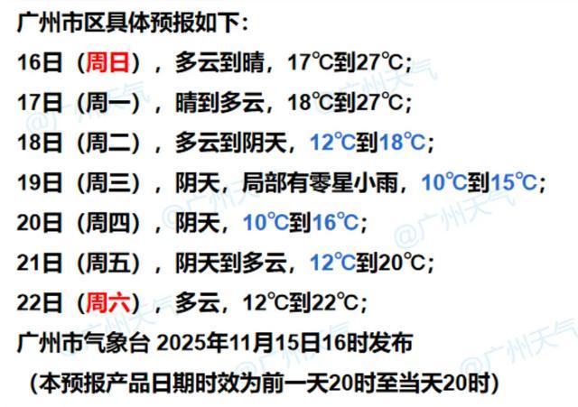 11月16日,粤西市县多云,其余大部分市县晴到多云。最低气温:粤北和珠三角北部市县15~18℃,其余大部分市县19~22℃。
