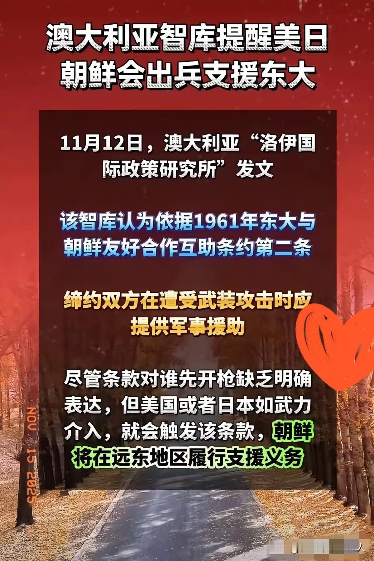 朝鲜!!! 这份情,中国14亿人民记下了 澳智库发声:日本若武力介入台海,朝鲜将依中朝条约参战支援中国! 朝鲜已经明确表态,一旦东方大国与日本开战,就会支持东方大国,像之前援助俄罗斯一样出兵对抗日本。 这可不是空口白话,中朝互助条约摆在那,关键时刻就是硬支撑。 朝鲜已经明确表态,会像之前援助俄罗斯那样,实打实出兵对抗日本,绝不含糊。 危难时刻见真情,这份硬核支持,中国14亿人民都记在心里!
