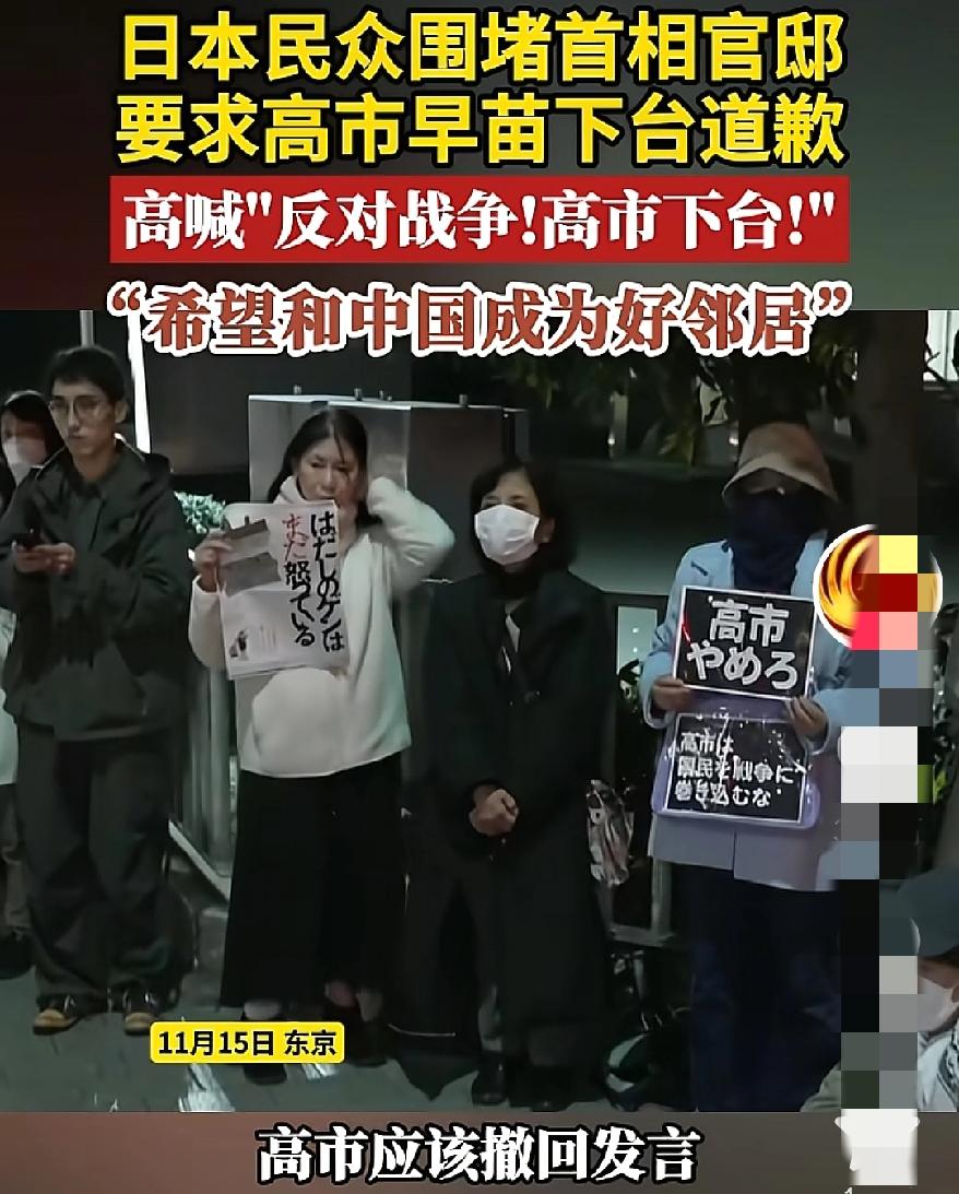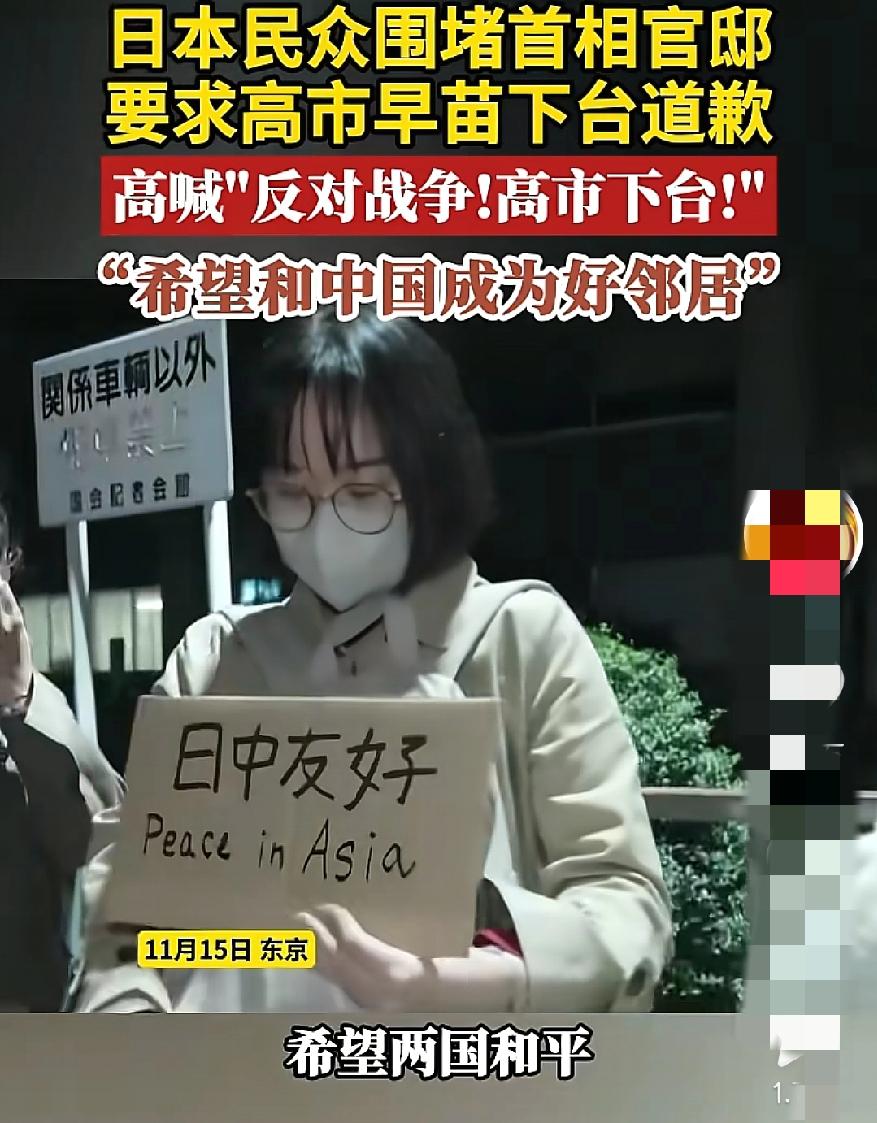 这下激起民愤了吧 日政客高市早苗一张嘴, 就说“日本人都对中国愤怒”,还鼓吹对立,可转头东京民众就堵了首相官邸,举着“日中友好”喊她下台。 估计日本还是有不少人,反对斗争的,而且像这个分明是少数政客在挑事。真以为煽动对立能博眼球? 普通日本人要的是和平邻居,不是政客嘴里的“对抗剧本”。别拿自己的偏执当民意,民众用行动喊出的“反对战争”,才是最实在的声音。 说到底,谁在搅浑水,谁在盼安宁,早写在人群的标语里了。你觉得这种“政客嘴硬、民众拆台”的戏码,还能演多久?高市早苗内阁 中国