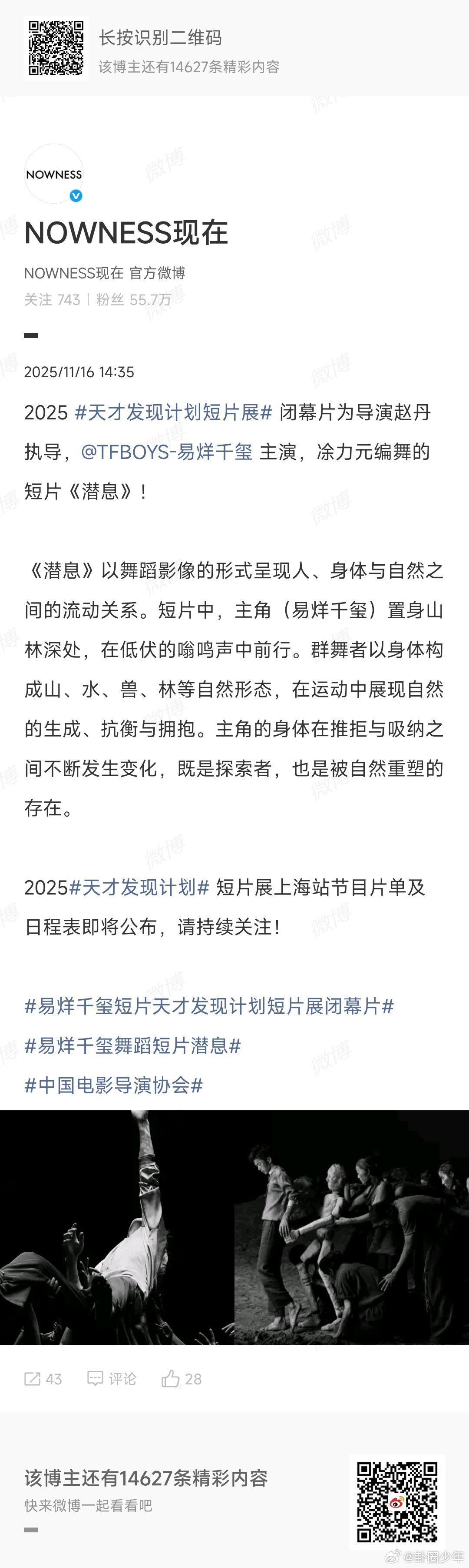 易烊千玺主演短片《潜息》定档!群舞者化身山、水、兽、林,主角在推拒与吸纳中完成自我重塑,上海站片单日程即将公布,蹲一波完整呈现~