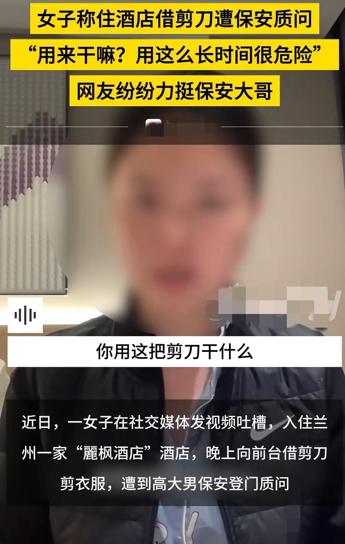 这下出名了, 不止甘肃,全国人都知道了, 谁能想到,女子入住酒店 借剪刀被骂上热搜, 本想发视频控诉酒店保安, 态度不好管得太多, 结果被网暴是自己! 女子说在兰州某酒店借剪刀剪衣服, 保安问用途还守在门口。 视频发出,网友却一边倒地给保安点赞, 说女子不识好歹。确实啊,酒店不借怕被投诉,借了又怕客人出意外担责,保安尽责却遭投诉,着实太难。 这事儿也让咱明白,看问题不能只看一面。大家说,要是你遇到这事儿,会站哪方呢?