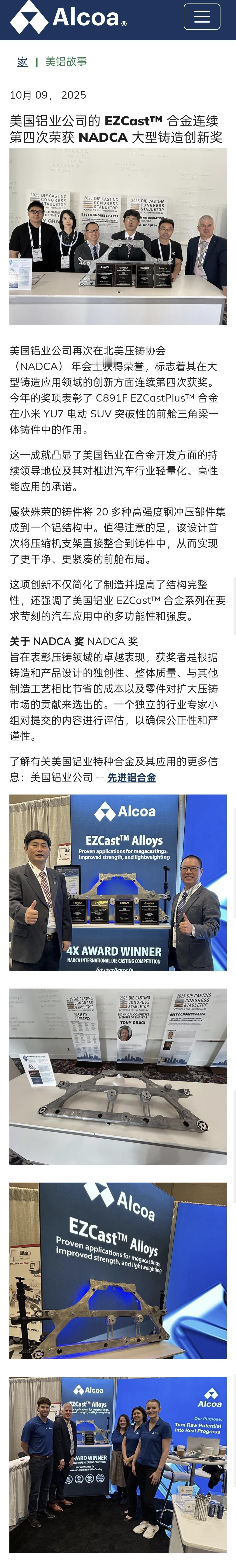 小米YU7的NADCA“最佳结构奖”被硬杠成“材料奖”,真挺离谱的。先看奖项英文“STRUCTURAL”,明晃晃是“结构”,质疑国际评委不认识“Material”,未免太秀下限了。获奖主体写着小米汽车,提名前三都是小米工程师,要是材料奖,得主该是供应商美国铝业才对。何况美铝自己都强调,奖项看的是产品设计创新、整体质量,这明明是夸小米的系统工程能力。把20多个钢件集成成一个铝铸件,还优化了前舱布局,这是实打实的结构创新。说白了,有些人就是不愿承认小米的正向设计实力。奥斯卡影帝穿高级西装,但奖项肯定颁给演技,哪有归功于服装师的道理?这个奖是小米工程师的功劳,也是用户的福利,毕竟更高刚性、更大前备箱都是实打实的好处。质疑可以,不如下次在技术上同台竞技,别在舆论上瞎带节奏。