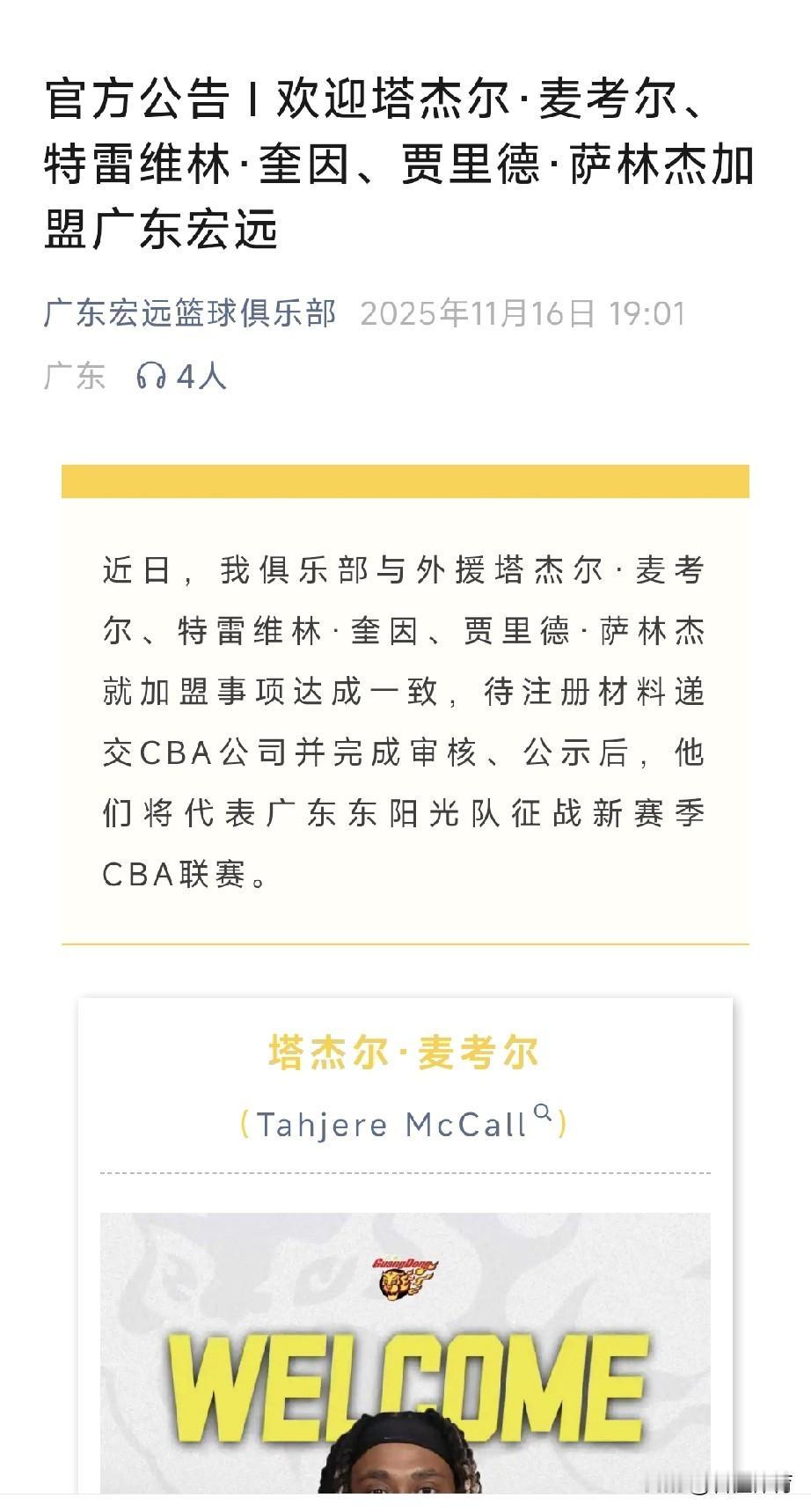 广东队官宣公告,奎因、萨林杰、麦考尔正式加盟!球迷:萨姆纳去哪里了? 广东队新