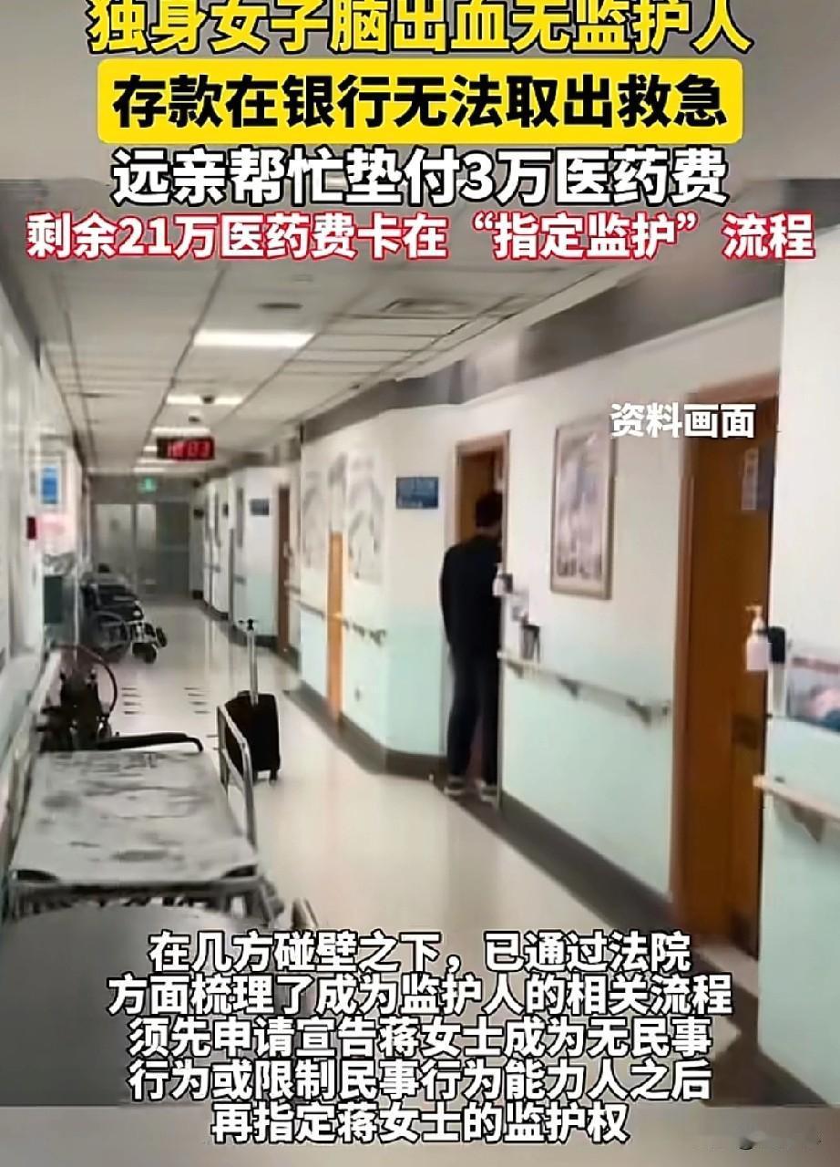 自己银行有存款,却不能救自己的命!46岁的蒋女士,自己未婚,父母双亡没有亲人 突发脑出血昏迷不醒住进了ICU,银行有存款,也买了商业重疾险,如今要救命了,钱却拿不回来了,因为没有一个能签字的亲人。 根据媒体报道,上海46岁的蒋女士因为脑出血需要紧急手术,但因为父母双亡,舅舅也不在了,没有一个人能签下这个字。 于是,翻遍了通讯录里面,能在上海联系上的,只有远房亲戚吴先生,吴先生在接到电话后立马赶来医院签字,并且和公司一起垫付了3万元的医药费,本来以为这样就可以了,没想到蒋女士的病情严重了。 转到了ICU病房看着呼吸机来维护,在这个病房里面,每天的费用不得了,很快医药费就涨到了21万,这个可不是一个小数目了,医院这边要求尽快缴纳药费。 吴先生哪里能承受的了,这边欠着费,那边银行有存款却不能拿出来,买了商业重疾险,只能在保险公司躺着,原因竟是没有亲属人员签字不能用。 吴先生找到了村委会求助,但还是行不通,只能走法律来解决。 此事引发热议!有网友表示,现在单身的这么多,以后终会成为普遍现象的,还是需要合理途径解决才行,生命耽误不起的 有的网友表示,这就是银行有存款,这要是换过来有贷款你试试,银行就得赶紧跑过来给你垫付药费,他怕你死了钱没人还了。 看似简单的事情,为什么那么难呢? 到底问题出在哪里?