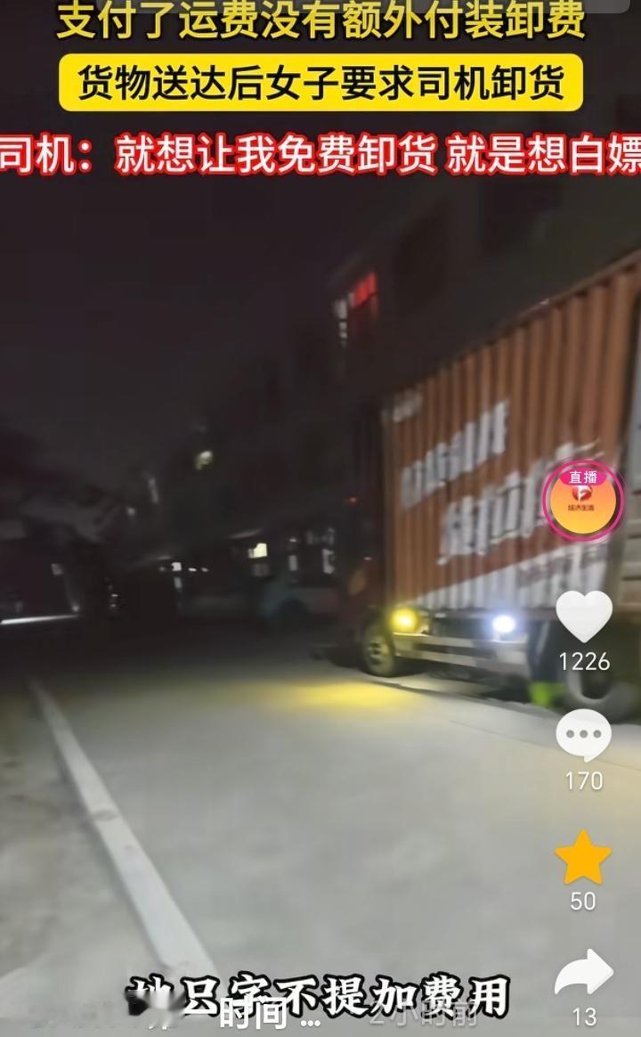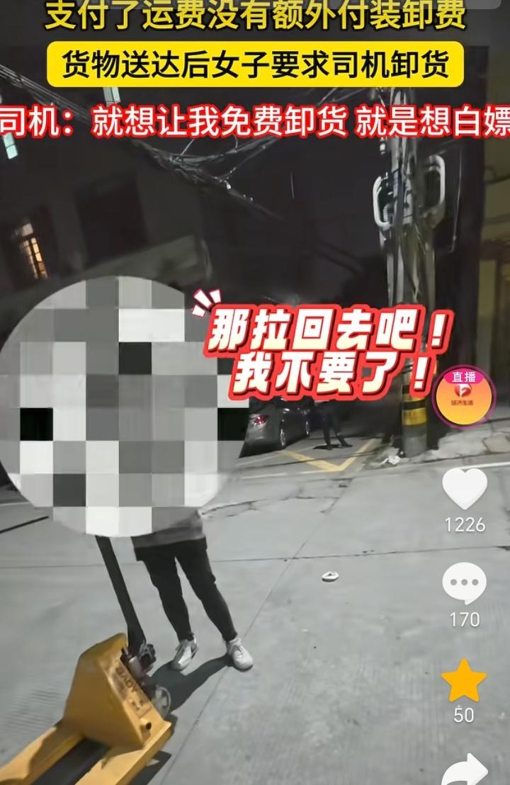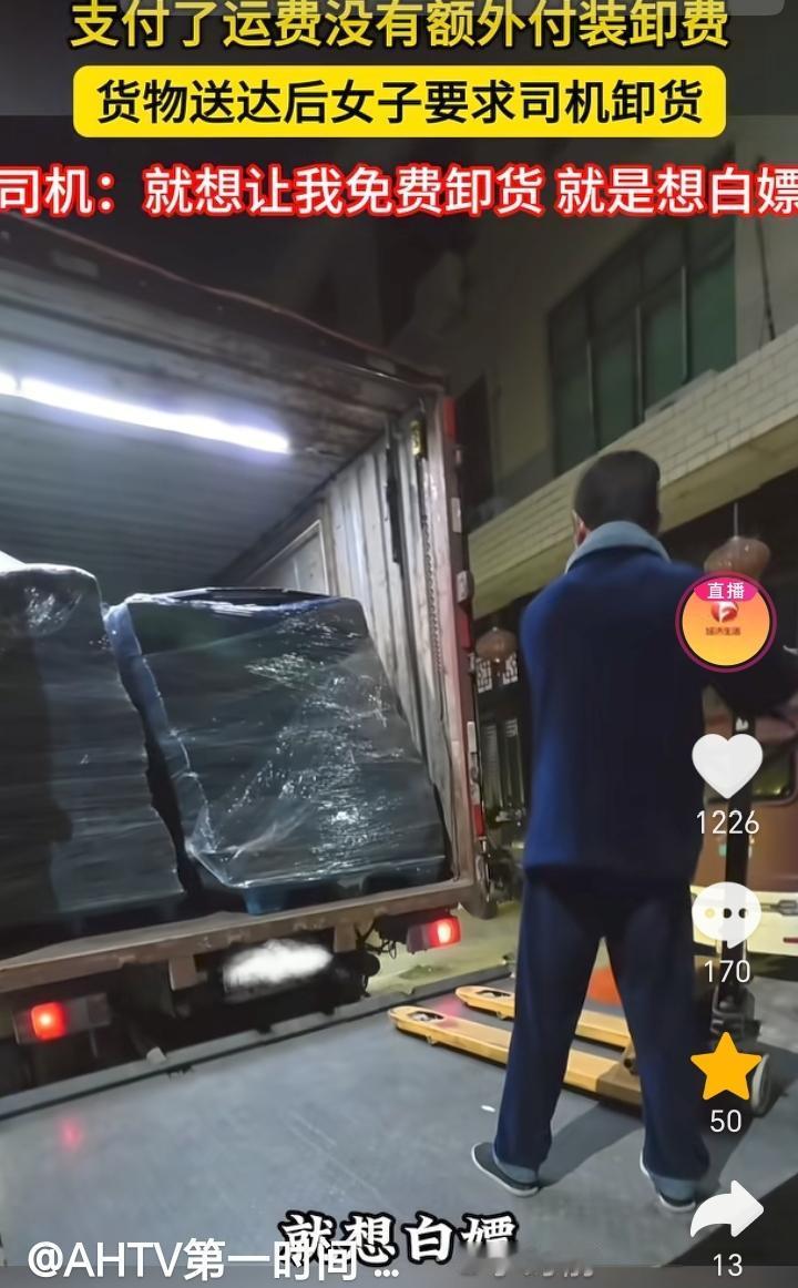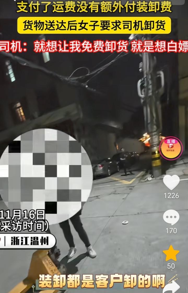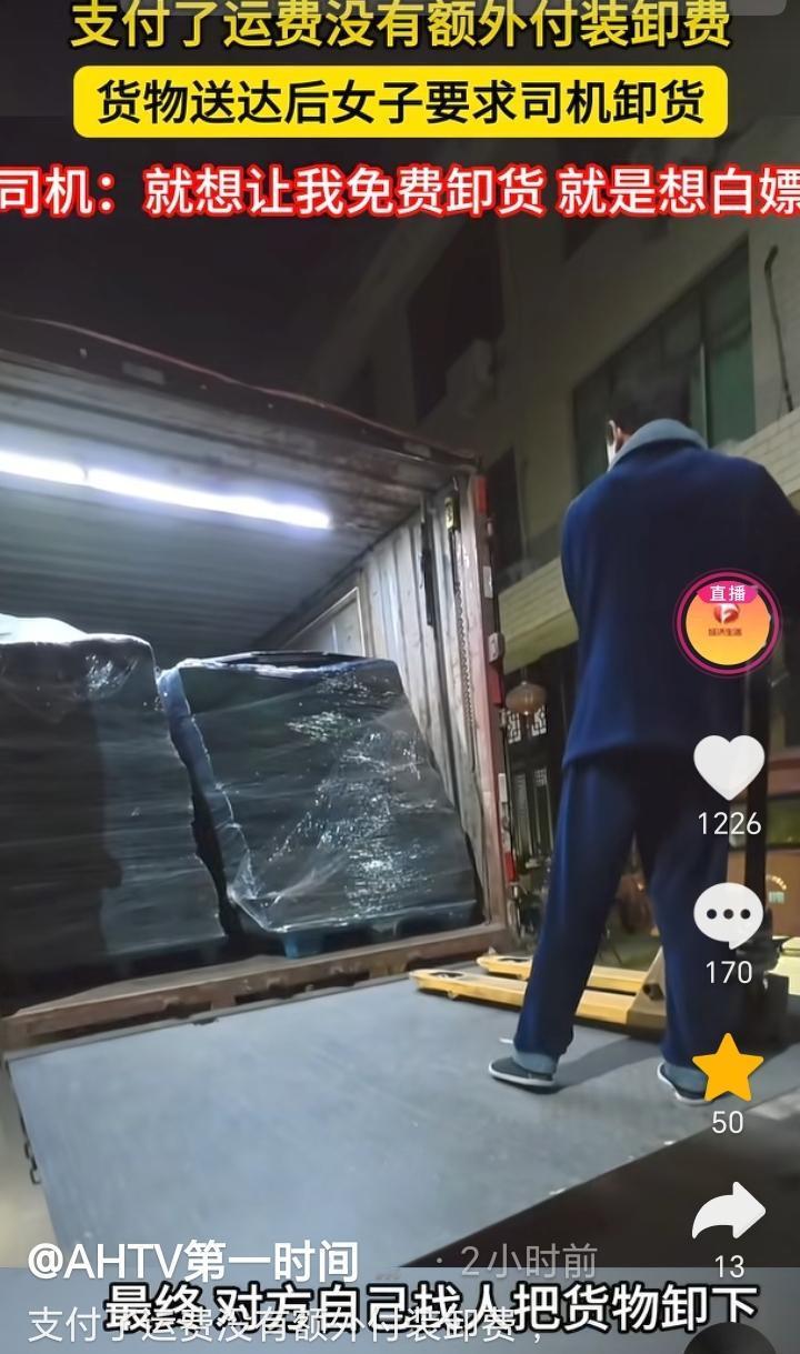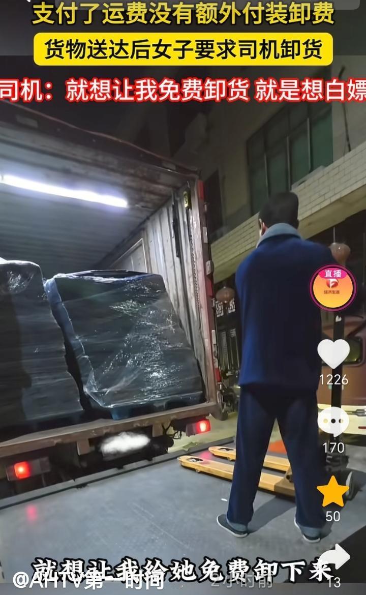 白嫖失败了!浙江温州,货车师傅拉了一批货,送到目的地后收货女子要求货车师傅给卸货,不卸就不要了,货车师傅表示,装卸都是客户的,自己只收到运费没有任何装卸费,如果需要卸货可以在平台上另外付费,她老是强调自己是女的会受伤,她只字不提加费用,就想白嫖让我免费给她卸,最终也是她自己找人把货卸了下来。 请人帮忙就要有请人帮忙的态度,只付了运费并没有给货车师傅付装卸费,所以货车师傅没有那个义务去免费帮忙卸货,女子这想白嫖的目的太明确了,哪怕单独给货车师傅加点钱,我觉得货车师傅也就给卸了,结果女子只字不提加钱还威胁货车师傅不卸就不要货了,这换做任何一个货车师傅都会恼火,在换做脾气不好的估计直接真拉走了,到时候估计女子还的说好话让拉回来。 货车师傅做法很正确,面对女子这样的态度,不退让不惯着。
