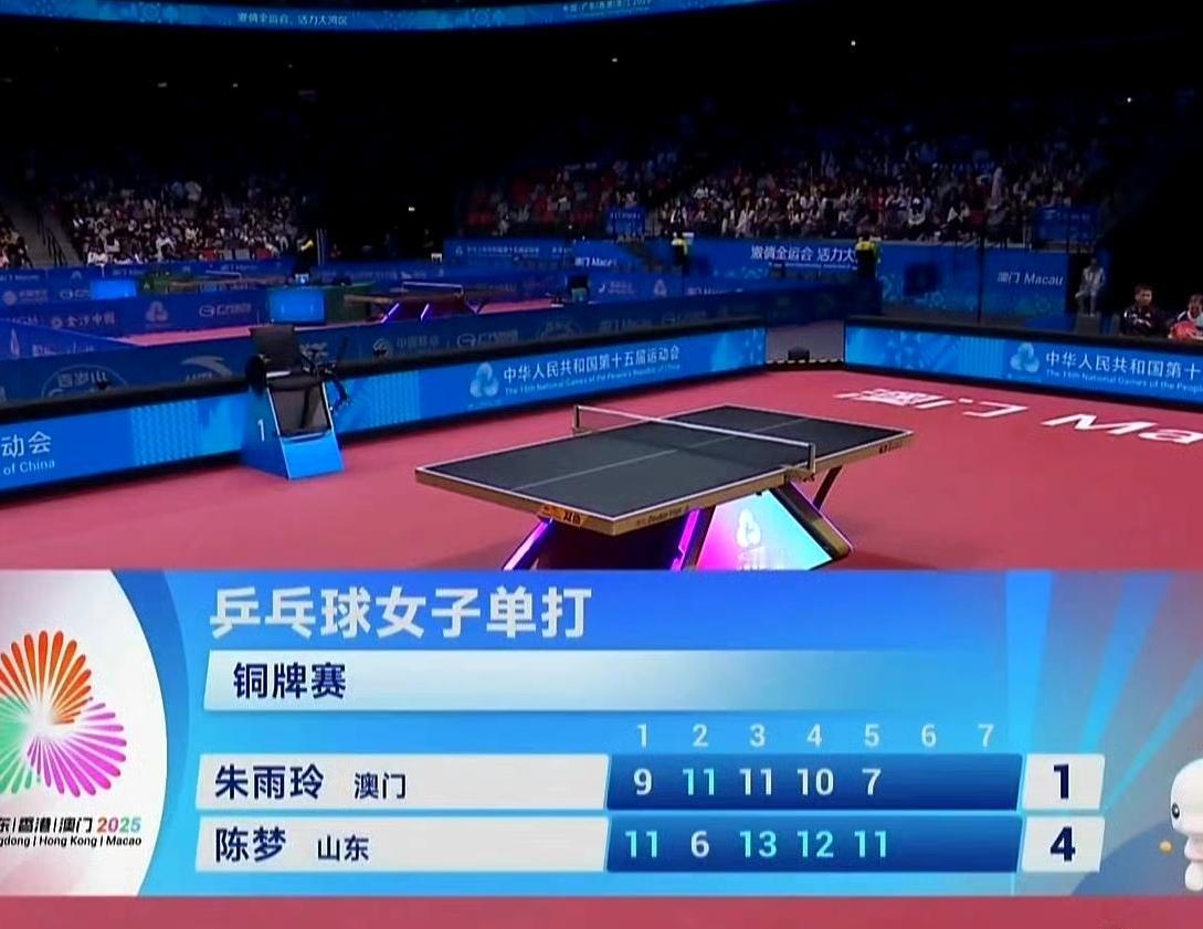 女单铜牌争夺战 陈梦4-1朱雨玲,最终大梦获得全运会乒乓球女子单项铜牌。 比赛跌宕起伏相当精彩,两个人的激烈厮杀引来现场阵阵喝彩声。 最扣人心弦的比赛场景出现在第三局和第四局。第三局陈梦7-1领先,被朱雨玲追到9-9平,陈梦13-11险胜。第四局5-9朱雨玲领先,陈梦完成了大逆转12-10,此时陈梦3-1大比分占优。 最终陈梦通过自己的顽强拼搏赢得了比赛,恭喜!