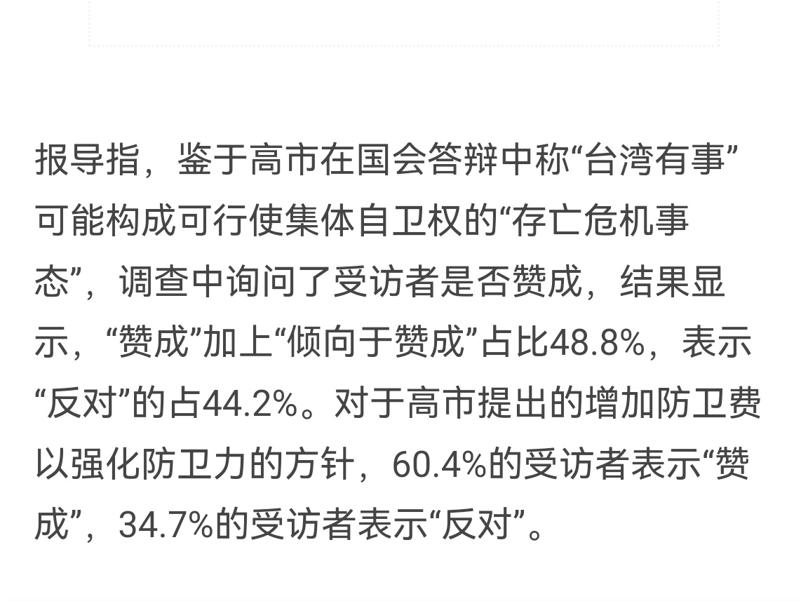 🔻日本共同社今日进行的全国舆论调查显示,高市早苗的支持率相较于上月上升了5.5%,支持率为69.9%。🔻在高市早苗发表极端言论后,支持率不降反升,很好,好得很。