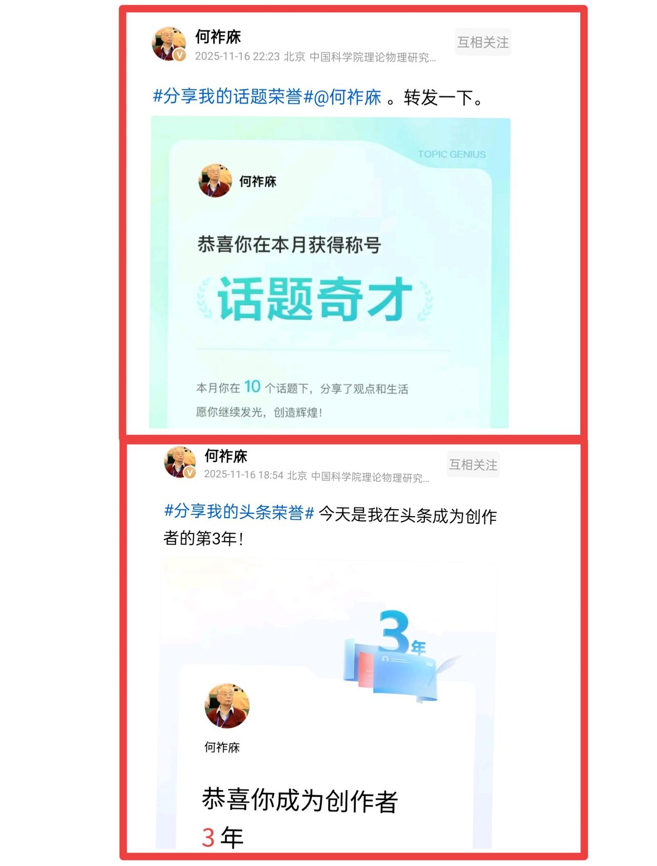 何祚庥老院士展示头条上的荣耀。11月16日,何老院士向大家分享了两个荣耀。一荣耀是在头条上创作已经达到三年了,另一荣耀是何老获得了“话题奇才”的称号。 这表明何老院士能积极接受新事物,体现出他不囿于传统,具有开放、包容的心态。何老先生乐于分享知识,很多事情他不说,大家都不知晓。他可能希望通过科普一番,提升公众对科学的认知和理解。 从另一方面来看,何老也是善于表达与交流的。现在很多年轻人就是缺乏交流,如果能看到何老院士善于与大家交流,能不能有所启发呢? 最后谈一谈何老院士在网络上的争议,这也是很正常的现象。以平台上的网络大V为例,没有哪一个大V能获得所有网友的青睐,这就是各有所爱。大家在网络上很多都是找找乐趣,观点不同时,还是要友好交流,要营造良好的网络气氛。