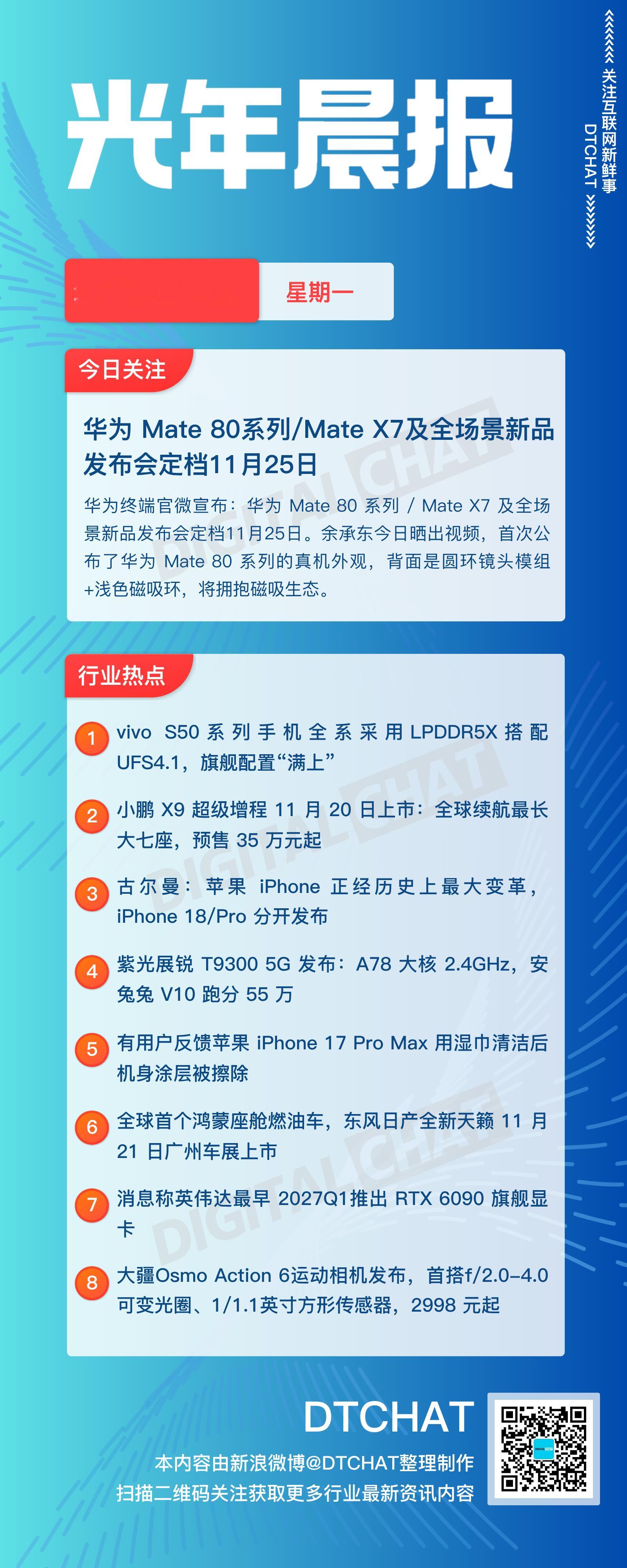vol.876|11月17日:DTCHAT今日关注:华为 Mate 80系列/Mate X7及全场景新品发布会定档11月25日