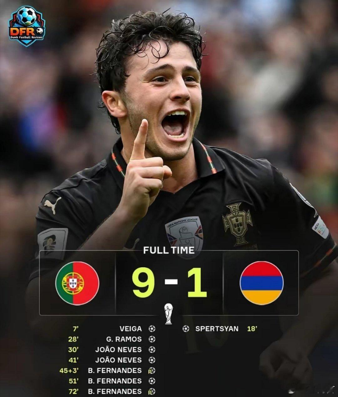 2026世界杯预选赛欧洲区第10轮:葡萄牙在没有克里斯蒂亚诺·罗纳尔多的情况下击败亚美尼亚,直接晋级2026年国际足联世界杯……👀🇵🇹⬇️他们以9-1的比分横扫亚美尼亚,完美地完成了这一壮举!😱😱👏布鲁诺·费尔南德斯和若昂·内维斯在罗纳尔多缺阵的情况下挺身而出,双双上演帽子戏法!⚽⚽⚽👏🇵🇹葡萄牙正式晋级2026年国际足联世界杯,而且是以压倒性的优势获胜!👏C罗禁赛,葡萄牙9比1狂胜亚美尼亚,不少球迷也再度提出一个问题,那就是:「葡萄牙没有C罗更强。」哈哈,一场对阵亚美尼亚的比赛,一场无关紧要的比赛,因为葡萄牙基本上已经晋级2026年美加墨世界杯,这只是时间上的问题。当然,这场9比1后,葡萄牙确定直接晋级世界杯正赛,C罗将迎来冲击世界杯冠军的最后机会,虽然C罗本人说这不是梦想,但他的履历表,真的独缺一个大力神杯。的确,没有C罗,这场比赛的葡萄牙进攻非常流畅,但对手是弱到不能再弱的亚美尼亚,所以大胜是大胜,但参考价值并不大。C罗依然可以帮助葡萄牙,这点无庸置疑,但的确不能再让一个41岁的老将去担任核心了,本场比赛有不少球员都证明了,他们绝对有担起责任的能力!