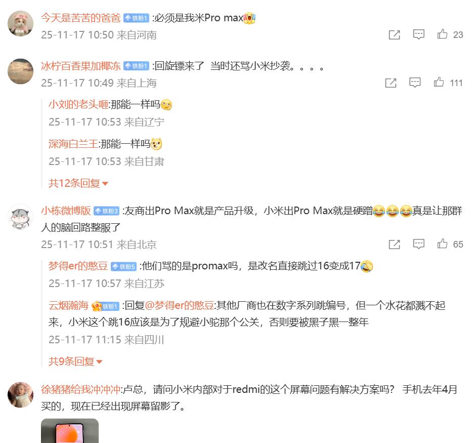 有意思了,卢伟冰这是在回应华为Mate 80 Pro Max吗?上午,余承东刚刚官宣了Mate 80的发布会定档在11月25日,他发文使用的就是Mate 80 Pro Max这个型号。 结果,我刚看到卢伟冰也发文了:越来越多的ProMax来了!不过6K档更强的还是小米17Pro Max,4K档更强是K90ProMax。 虽然没有明显的针对,但在这个时候发这样的内容,那肯定是指向华为的。 那么这样就比较有意思了。我看评论区里也是有很多人慷慨激昂了,接下来这半个月内,也就是Mate 80发布的前后两周,华为要准备好这些人的口水了!