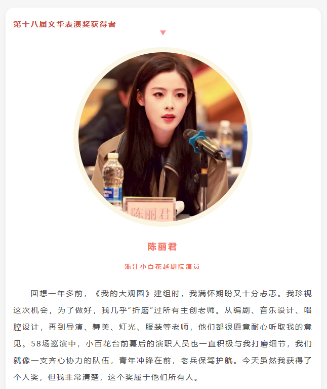 【】 近日,第十八届文华奖获奖单位和代表座谈会在重庆召开。会上, 作为第十八届文华表演奖获得者发表获奖感言:回想一年多前,《我的大观园》建组时,我满怀期盼又十分忐忑。我珍视这次机会,为了做好,我几乎“折磨”过所有主创老师。从编剧、音乐设计、唱腔设计,再到导演、舞美、灯光、服装等老师,他们都很愿意耐心听取我的意见。58场巡演中,小百花台前幕后的演职人员也一直积极与我打磨细节,我们就像一支齐心协力的队伍,青年冲锋在前,老兵保驾护航。今天虽然我获得了个人奖,但我非常清楚,这个奖属于他们所有人。
