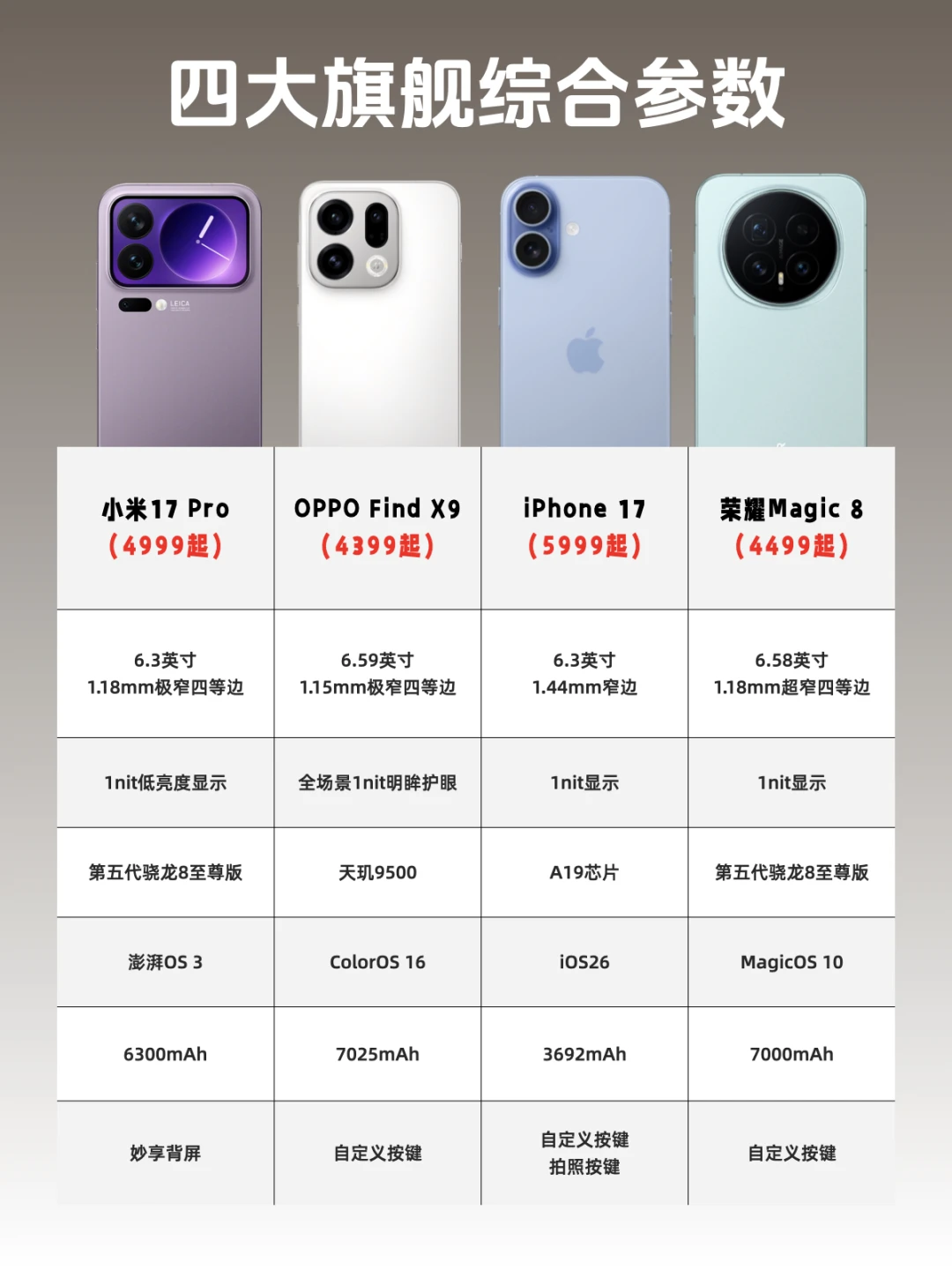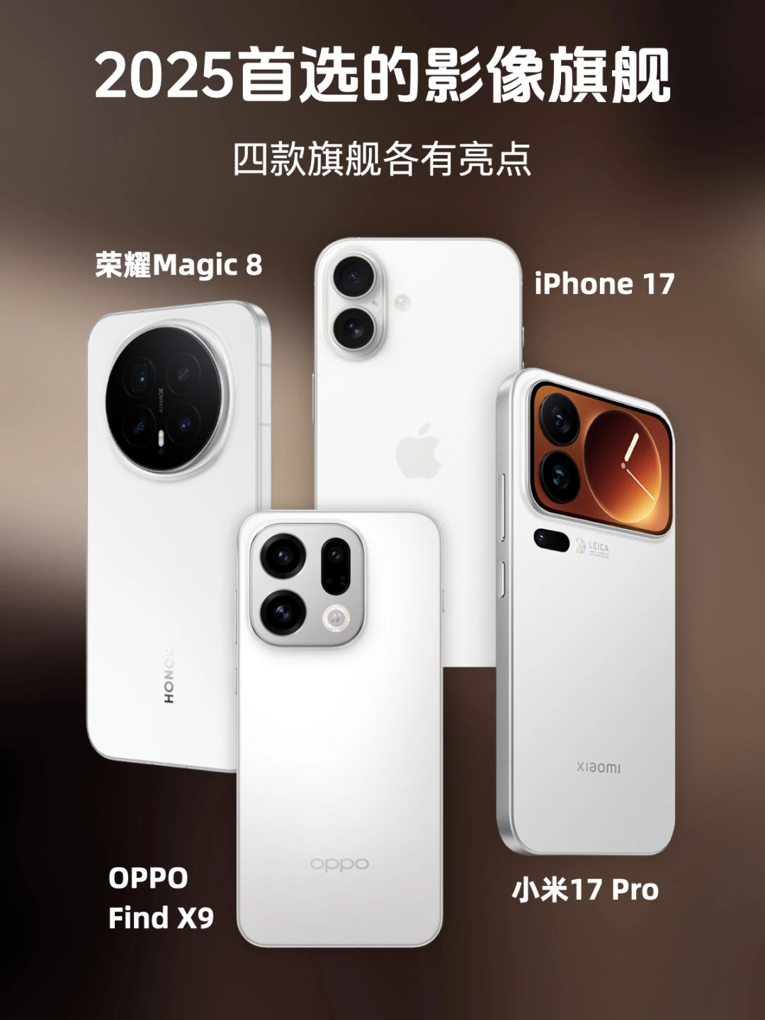 年底换手机的同学看过来,预算4000-5000,我给大家总结了几款热门的中杯旗舰,分别是iPhone 17、OPPO Find X9、小米17 Pro、荣耀Magic8,简要说一下怎么选吧~