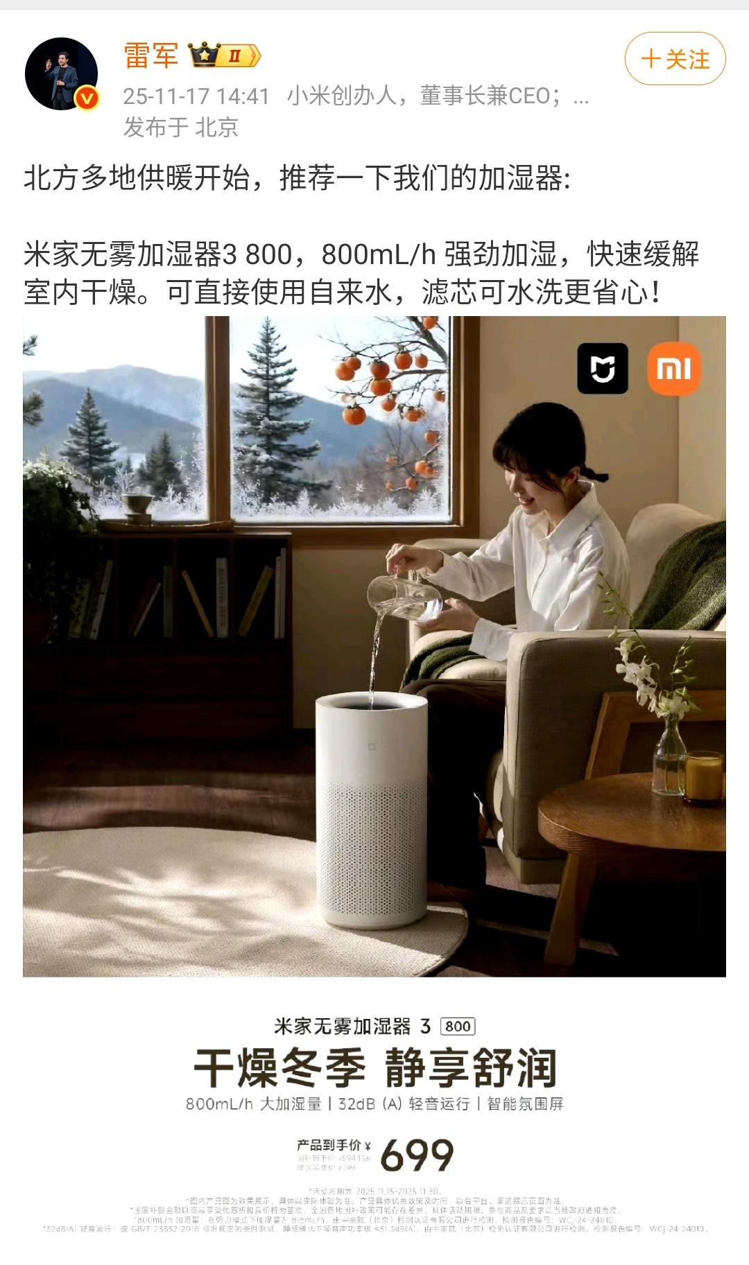 雷军又恢复带货了! 雷军说北方多地供暖开始,推荐一下我们的加湿器,米家无雾加湿器3 800,800mL/h 强劲加湿,快速缓解室内干燥。可直接使用自来水,滤芯可水洗更省心! 可以使用自来水,这个优势还是非常大的,以往大家使用加湿器的时候,一般都是买纯净水或者蒸馏水来使用,就害怕使用自来水不行。 小米的这一款产品滤芯可以水洗,相当于滤芯,过滤掉了水中的大部分杂质。各位是怎么看的?欢迎评论区留言。