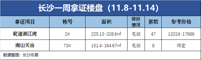 新房供应方面,根据长沙市住建局官网信息及克而瑞湖南统计显示,上周(11.8-11.14)内五区新增供应项目2个,共55套房源,详情如下: