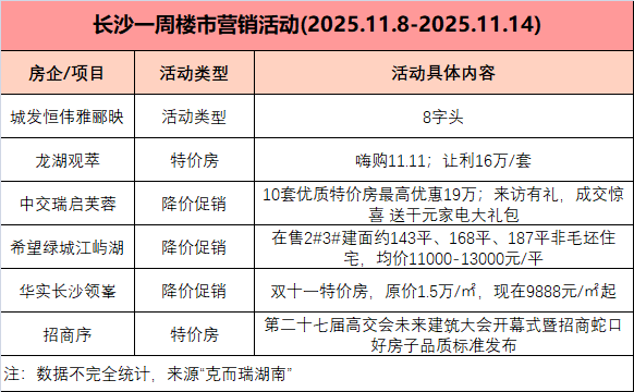2025年11月17日,克而瑞湖南发布了2025年11月第2周(11.8-11.14)的楼市周报数据,新房市场供应有较大幅度下滑。成交方面虽然有所回升,但根据市场反馈,年底只有1个半月了,不少开发商明显感觉到压力,这一点从部分楼盘的双十一大促销中可以看到,去库存将是未来重心。