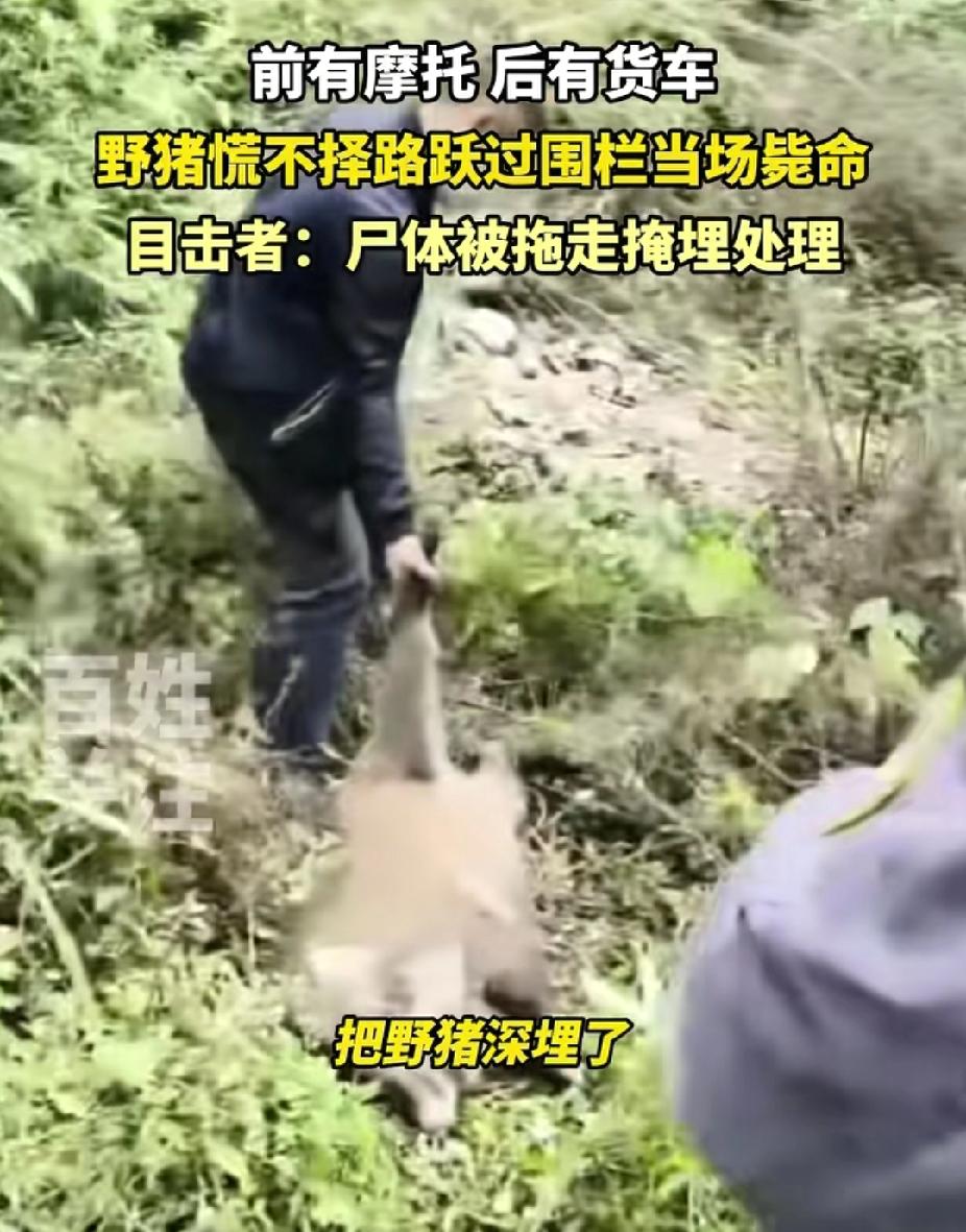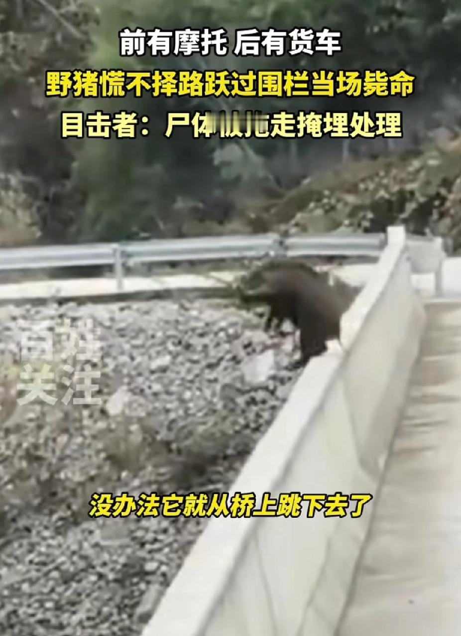 近日,重庆,一头野猪桥上行走看到前面有车,往回跑也有车,突然,它跃过桥栏跳了下去。目击者: 桥有20多米高,当场就摔死了,后续已深埋。原来,当天胡先生开着车从高处下来,他是准备过大桥的,这头野猪可能是受到了惊吓。 它就到桥上,直接跑到桥的另一端,是准备往坡上跑的,结果桥口刚好有人骑的摩托车,把它的路给拦住了,于是它又返回到桥上。 结果当它走到接近桥中间的位置,却突然一跃从桥上跳了下去。 因为这个大桥有二十几米高,而桥下是河道,有石头,所以这头野猪跳下,结果当场摔死。 后续,当地村民和胡先生把这头野猪拖走深埋了,不然会发出臭味。 对此有网友说: 以前有“守株待兔”,这回可以有“守桥待猪”。 也有网友说: 野猪肯定不知道,桥外面什么情况,跳起来之后明显懵了。 还有网友说: 野猪确实厉害,能蹦那么高,要是养的猪,上个门槛都费劲。 估计这头野猪是慌不择路跳的桥,它一开始是看到这边有车,就跑桥上去,想从那桥那一端离开,那曾想桥那一端有摩托车拦住它的路,因此它只好又跑到桥上。 结果它一看两头都有车拦住,惊慌下的它就想着从桥上跳下去寻找出路,没想着桥外面是什么样子。不过它这跃上桥栏的姿势还挺标准,而且是比家里养的猪蹦得高。 最后,这头野猪结局是注定的,只是没想到,胡先生没有把野猪拉回家,吃野猪肉。 反而他是把野猪拖出河道,找地方深埋了,这样处理也可以,毕竟放在河道不合适。 (来源: 百姓关注)