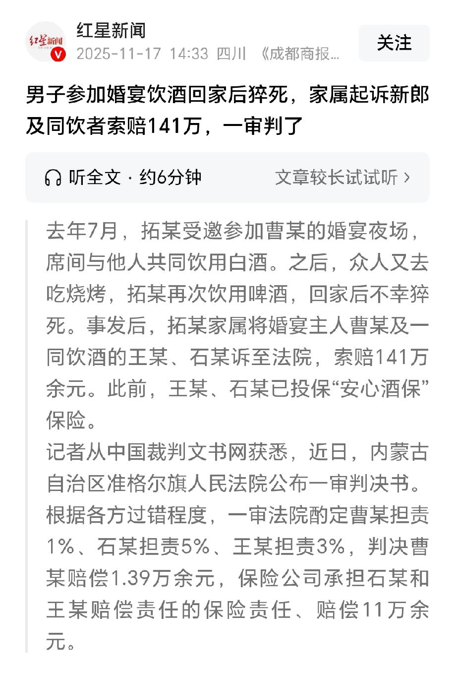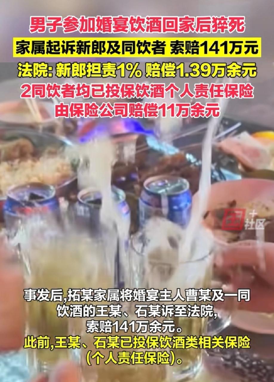 内蒙古,男子参加婚宴期间,喝了几杯白酒。婚宴结束后,他还不尽兴,又联系朋友去吃烧烤,还喝了少量的啤酒。谁能料到,男子回家后,当晚发生心源性猝死。男子家属悲痛之余,把新郎官以及一起喝酒的朋友告上法庭,索赔141万。新郎:正常办个婚宴,怎么还摊上了官司?一起喝酒的朋友更是委屈,他们没有强行敬酒和劝酒,男子喝酒并不多,回家的时候好好的,猝死了凭什么要他们赔偿?法院审理后,作出的判决让他们彻底傻眼。 去年7月,男子拓某高高兴兴去参加朋友曹某的婚宴,万万没想到,这一去竟成了永别。 一场热热闹闹的喜酒加一顿深夜烧烤,让他突发心源性猝死,原本的大喜事变成天人永隔的悲剧。 拓某40多岁了,平时性格爽朗,身体看着也硬朗。2023年,他刚做过职业健康检查,心脏方面没有任何基础疾病。 2024年7月6日晚上,曹某的婚宴夜场办得格外热闹,拓某收到邀请后,早早赶到现场沾喜气。 宴席上,拓某被安排和老熟人石某还有几位朋友同桌。不知是谁先起了头,大伙儿纷纷端起酒杯,你一言我一语地提议碰杯。 拓某本就爱热闹,架不住众人起哄,拿起酒杯就跟同桌的人挨个碰了起来。 接下来的一个多小时里,桌上的气氛越来越热烈,有人聊工作,有人谈家常,酒杯碰撞的清脆声响就没断过。 石某坐在拓某旁边,两人平时关系不错,时不时就凑在一起喝一杯。 整个婚宴期间,大家都是自愿喝酒,没人硬灌,也没有罚酒的情况。拓某也喝得挺痛快,前前后后大概喝了4杯半白酒。 婚宴结束时已经快半夜了,拓某意犹未尽,拉着身边的石某,还要再去吃点烧烤。 石某本想回家,但架不住拓某再三邀约,只好点头同意。 随后,拓某又掏出手机给朋友王某打了电话,约他一起出来喝酒撸串。 王某一听有局,没多想就答应了,约定在某小区附近的烧烤摊碰面。 三人赶到烧烤摊,拓某一坐下就喊着要啤酒。王某点了6瓶啤酒,他们一边吃着烧烤,一边喝着啤酒吹着牛皮。 这顿烧烤没吃多久,拓某喝了大概小半瓶啤酒,就说有点困了,想先回家。 当时他虽然脸色还有点红,但说话条理清晰,走路也稳稳当当,石某、王某两人见他状态还行,就没多挽留,看着他打车回了家。 可谁也没料到,第二天一早,噩耗就传来了,拓某走了,是心源性猝死。 突如其来的变故让拓某家属悲痛欲绝,好好的人参加一场婚宴就没了,他们实在无法接受。 思来想去,家属认为曹某作为婚宴主人,王某、石某作为一起喝酒的同伴,都该为拓某的死负责。 于是,拓某的家人在2025年4月,将三人连同保险公司一起告上法庭,索赔死亡赔偿金、精神损害抚慰金等共计141万余元。 接到法院的传票后,曹某和两位朋友彻底懵了。 曹某觉得很委屈,他就是正常办个婚宴,邀请朋友来热闹热闹,没逼谁喝酒,怎么还摊上官司了? 王某和石某更是满肚子冤枉,他们辩称全程没有强行敬酒、劝酒,拓某喝酒都是自愿的,而且喝得不算多,回家时状态也没问题,他猝死纯属意外,凭什么要自己赔偿? 从法律角度而言,是否需要赔偿,不是看自己是否委屈,而是看是否存在过错。 依据《民法典》第一千一百六十五条规定:行为人因过错侵害他人民事权益造成损害的,应当承担侵权责任。 依照法律规定推定行为人有过错,其不能证明自己没有过错的,应当承担侵权责任。 法院审理认为,拓某作为完全民事行为能力人,应该清楚自己的酒量和饮酒可能带来的风险,而且朋友们不存在强劝酒行为,所以拓某本人要承担主要责任。 但这并不意味着其他人毫无过错,曹某作为婚宴组织者,对受邀宾客有合理的安全保障义务,虽然没有强劝酒,但没尽到适当的提醒劝阻责任,酌情担责1%。 石某全程参与了婚宴和烧烤两场酒局,明知拓某已经喝了不少白酒,却没及时有效劝阻他继续喝啤酒,存在一定过错,担责5%。 王某虽然没有参加婚宴,但明知拓某喝了白酒仍未劝阻,也有一定过错,担责3%。 法院还查明,王某和石某都投保了安心酒保,保险条款明确约定,被保险人在聚餐中因过失造成第三者人身伤亡,保险公司需要在限额内进行赔付。 最终,法院经过核算拓某的各项损失,判决曹某赔偿1.39万余元;保险公司在石某和王某的保险责任范围内,分别赔偿6.95万元和4.17万元,共计11.12万元,其余损失全部由拓某自行承担。 一场原本喜庆的婚宴,一顿看似平常的烧烤局,因为一次意外猝死变得面目全非。 拓某家属失去了亲人,曹某和朋友们也无辜卷入官司,闹得人心惶惶,这场意外没有赢家。