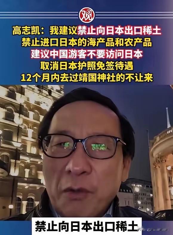 高志凯对中日关系最新发声! 一向言辞犀利、观点独到的高志凯先生,对当下的中日关系最新发声,说出了许多国人的心声。 他的观点可谓一语中的,建议国家禁止向日本出口稀土,禁止进口日本的海产品和农产品,建议中国游客不要访问日本,取消日本护照免签待遇,12个月内去过靖国神社的人员不让来中国。 禁售稀土、禁买海产品,无疑会断了日本产业链,给日本的产业与经贸带来致命一击。而取消日本护照、禁止拜鬼的日本人来中国,则是给日本人立规矩,让他们正视历史,不得伤害中国人的民族感情。至于建议中国游客不去日本,国家外交部已经公告,可以说是不谋而合。 不得不说,如果事态真的朝着高志凯先生的建议方向发展,恐怕用不着兵戎相见,日本就会先认怂服输,一蹶不振。