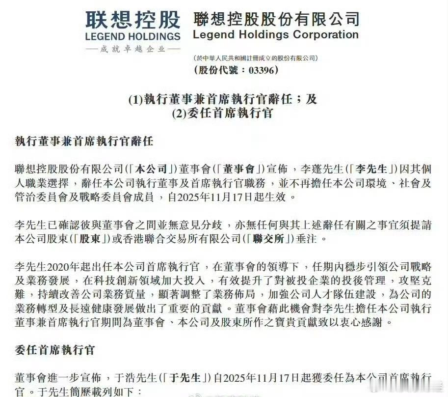 11月17日,联想控股发布公告,宣布核心人事调整,相关变动当日正式生效。公告显示,李蓬因其个人职业选择,辞任公司执行董事及首席执行官职务,并不再担任公司环境、社会及管治委员会及战略委员会成员,自2025年11月17日起生效。同时,董事会进一步宣布,联想控股委任于浩为新CEO,自2025年11月17日起接任。公告显示,于浩,2021年加入联想控股,现任联想前瞻技术研究院院长,在物联网、大数据、AI 等领域兼具技术研发与产业落地经验,持有公司15.8万股H股。董事会表示,此次调整未涉及董事会其他成员变动,将确保战略执行的连续性。