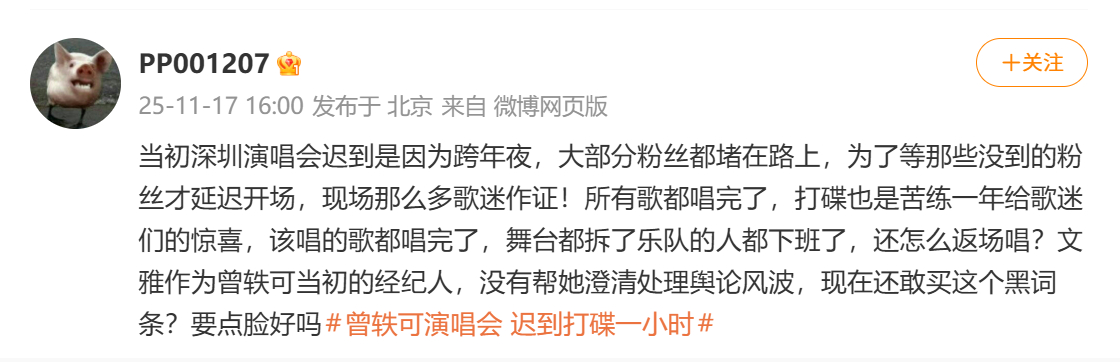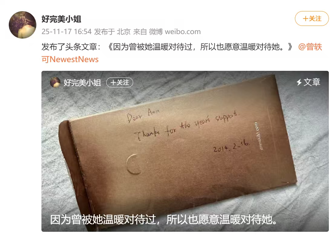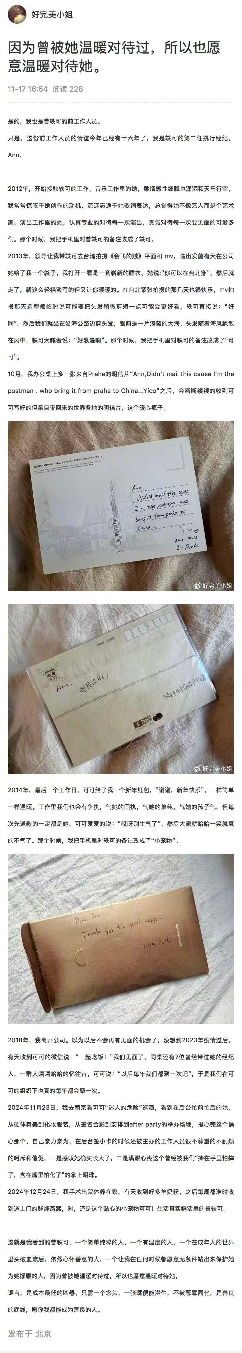 曾轶可事件引发争议后,不仅爆料人被扒出是前经纪人文雅招进来的私生,十多年来合作的历任工作人员也陆续发声力挺曾轶可。真情实感的文字里是长期和曾轶可工作相处的感受, :夸她坚持十年如一日打磨作品靠的不是“冷漠”而是对舞台的赤诚; :夸她重情重义的典型的i人,连讲话都不敢大声; :在绝大多数时间里,轶可都是谦和专注且极度合作的,共同经历的无数日夜里,那些高效,愉快相互成就的时刻才是工作的主旋律; :夸曾轶可“一个简单纯粹的人,一个有温度的人,一个在成年人的世界里头破血流后,依然心怀善意的人,一个让我在任何时候都愿意无条件站出来保护她为她撑腰的人,因为曾被她温暖对待过,所以也愿意温暖对待她。”