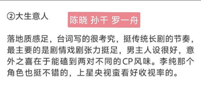 新一波看片repo迪丽热巴 陈星旭《枭起青壤》:滤镜稍重,部分配角略NPC,得沉下心看陈晓 孙千《大生意人》:传统剧风,台词讲究,男主人设很拉好感宋威龙 赵今麦《骄阳似我》:cp感意外很足,节奏舒服,超出预期们业内不要骗我啊啊啊啊我真信了,我之前看骄阳似我的预告心都凉了现在又有点心肺复苏了