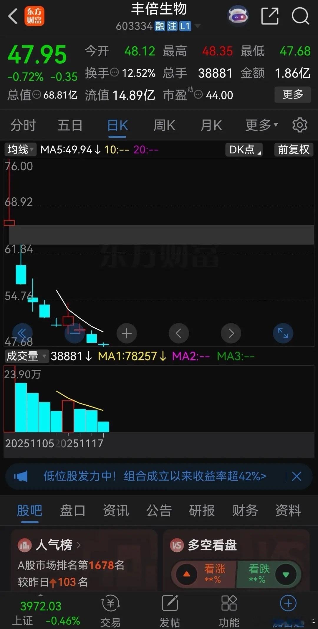 还敢买新股吗?丰倍生物,上市9天下跌7天,从最高76元跌到今天的47.68元,跌幅高达37%。二级市场上进场的股民,持有到现在全部被“埋”!很多人认为新股前五天没有涨跌幅限制,都想着一夜暴富,博一博,单车变摩托。但最终是宝马进去,自行车铃铛出来,一个个亏得鼻青脸肿!