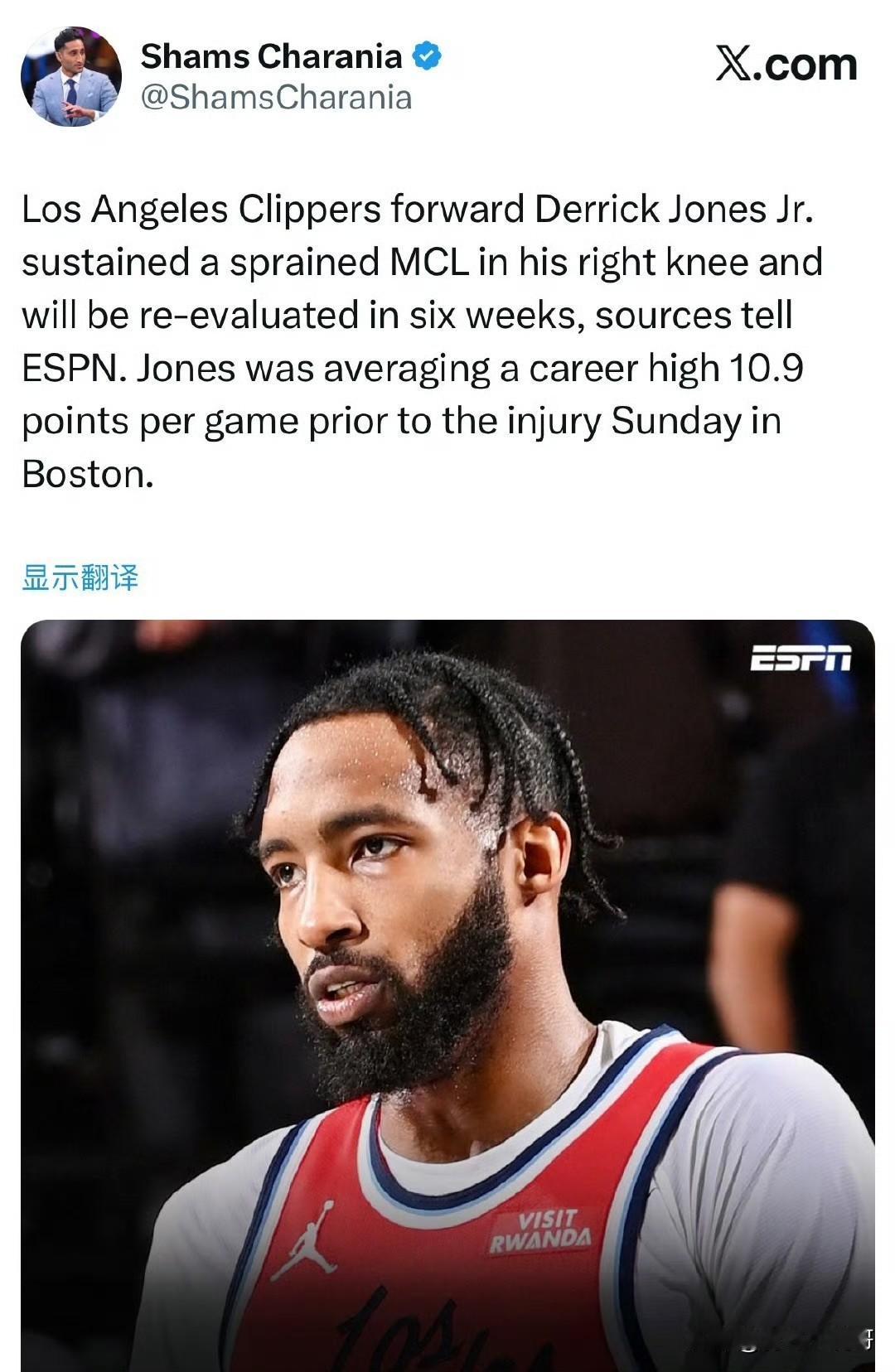 再伤一员大将!!!小琼斯右膝内侧副韧带扭伤,六周后接受检查! 根据记者Shams最新消息透露,我从内部消息人士得知,快船前锋小琼斯在经过检查后遭遇了右膝内侧副韧带扭伤,他将于六周之后接受重新检查。 果然还是没有意外,但是幸运的是不是报销级别等非常严重的伤病,但是对于快船来说已经是灾难级别的了。 本赛季快船两员大将伦纳德和小琼斯都是被对手所伤,伦纳德是被对手推了一下直接脚踝扭成90度,而小琼斯也是被对手一下打到了右膝,真的是运气不佳。 小琼斯本赛季可以说是迎来自己职业生涯的新高,本次受伤他将至少缺阵近两个月,快船的未来越来越模糊了。 今天快船继续背靠背打76人,又是一个客场还是背靠背,压力山大! 德里克琼斯 快船