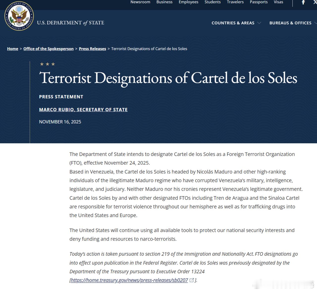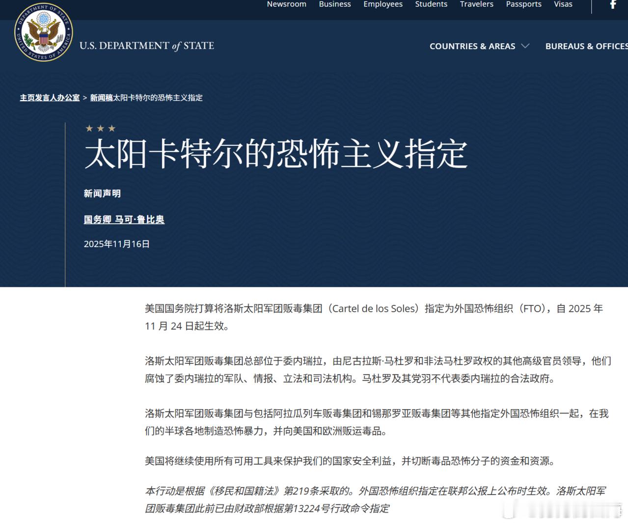 美国计划把“洛斯太阳军团贩毒集团”列为外国恐怖组织(FTO),11月24日起生效。