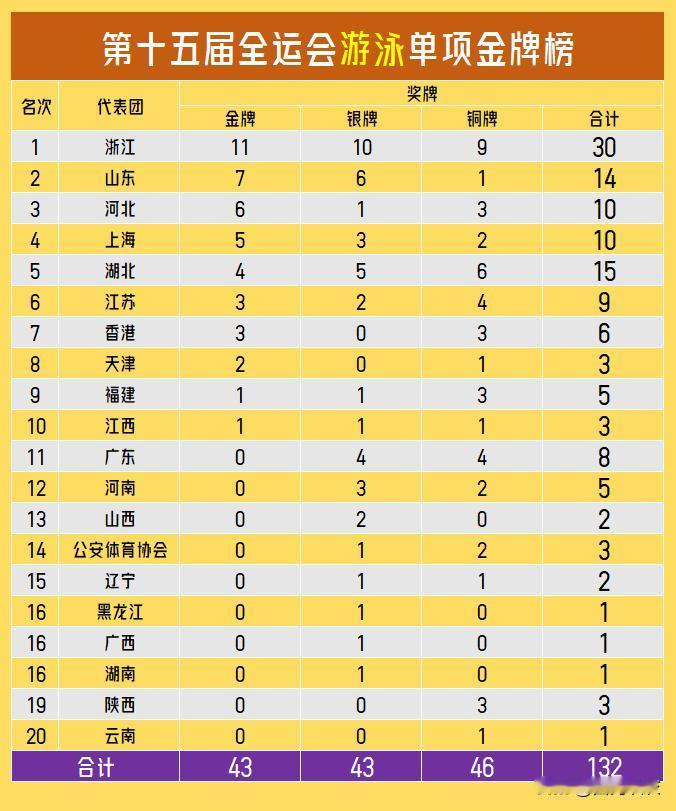 【游泳43项全收官!20队分132枚奖牌,浙江队金牌奖牌双榜遥遥领先!】 本届全运会第二大项目游泳昨晚收官,马拉松游泳在内的43个细分项目的争夺落下帷幕。 浙江队以11金10银9铜的成绩一马当先,领跑金牌、奖牌双榜。山东、河北、上海、湖北均斩获十枚及以上奖牌分列金牌榜二三四五。