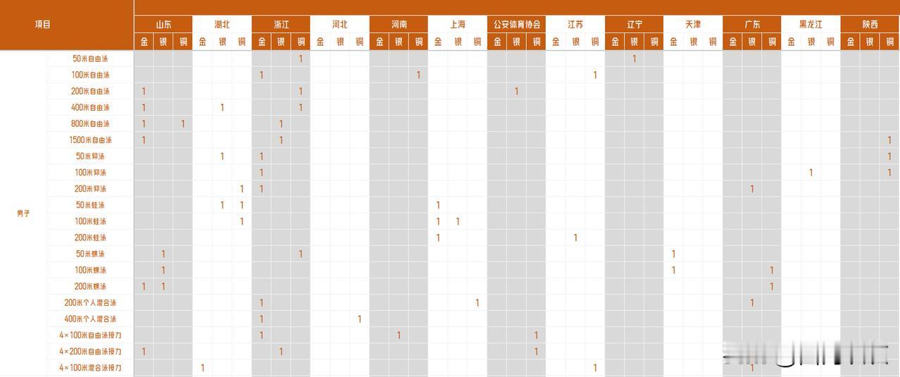 【男子游泳大格局!自由泳看山东,仰泳混合泳看浙江,蛙泳上海蝶泳天津优势明显!】 游泳是全世界综合体育赛事中仅次于田径的大项目,欧美一直占据统治地位。 从奥运会和游泳世锦赛看,我国游泳项目成绩在稳步提升,尤其在竞争激烈的男子游泳领域我们需要更多的孙杨、潘展乐。 本届全运会来看,男子游泳分优势集中在几个省市级代表队,练好内功,期待爆发。