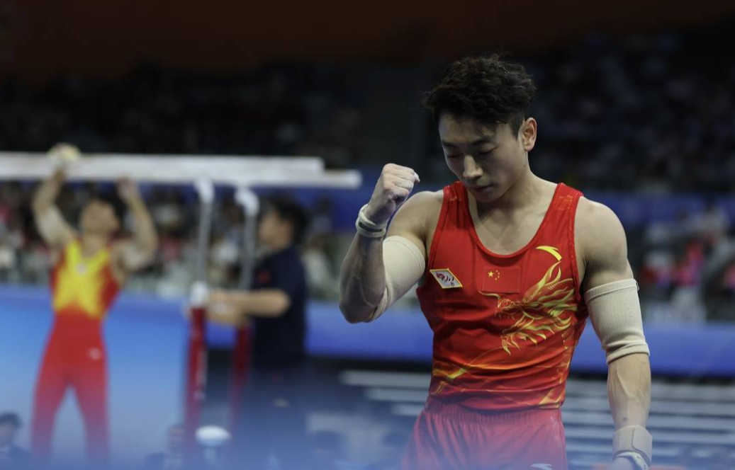 第十五届全国运动会体操项目男子双杠决赛中,奥运冠军、四川名将邹敬园以完美表现摘得