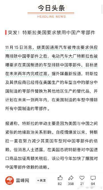 特斯拉被要求禁用中国产零部件万幸对咱们买国产的Model 3和Y没啥影响,你们说老美这算不算搬起石头砸自己的脚?【来自懂车帝车友圈】