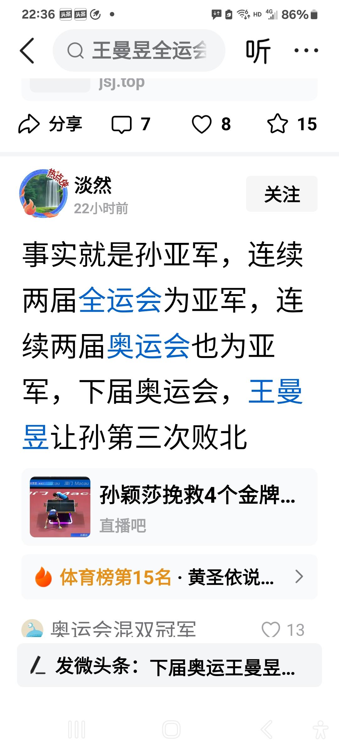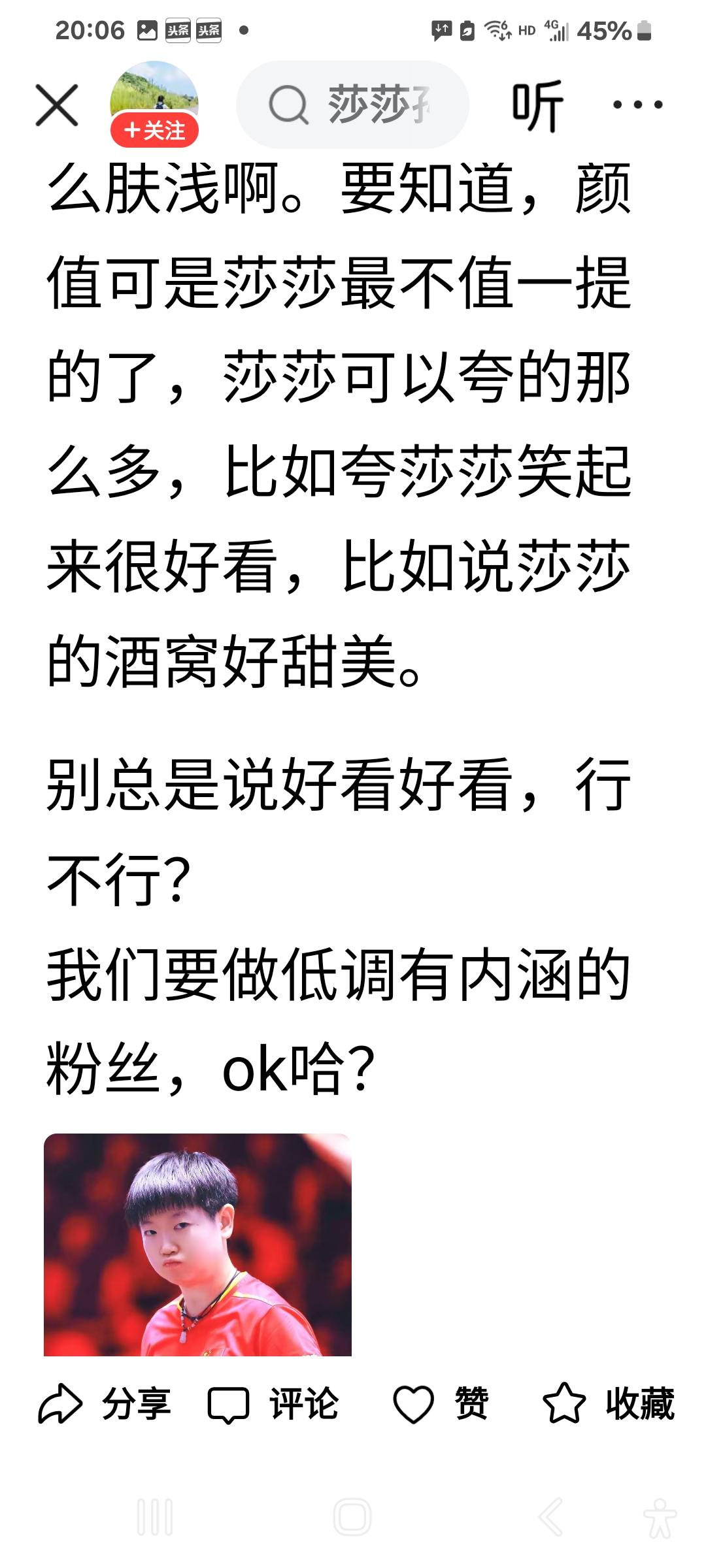 莎莎比任何球员都要难,都要不容易! 球迷想要她赢,赞助商想要她赢,她自己世一的实力尤其是她比别人多付出的努力,自己也希望赢,这些都是莎莎巨大压力的来源。更可怕的压力是,只要她一输,黑子全都从各个角落出来网暴她,这一点是她所有压力中最大的压力。 譬如说,一个黑子这样网暴她,事实就是孙亚军,两届全运会全是亚军,两届奥运会全是亚军,下届奥运会WMY还要让她败北。下届奥运会还早着呢,就如此诅咒一个女孩儿,心太黑太毒辣了吧!还有,那么软软糯糯、可可爱爱的莎莎,黑子又在她的长相上进行攻击,太卑鄙,太肮脏,太下作,简直丧失人格! 但是输球后的莎莎,虽然难过,虽然有黑子在丧尽天良地攻击她,她还是表示要全力帮河北队打好团体赛。这是一个怎样心底善良、怎样心底宽广、怎样坚强的莎莎呀。这就是莎莎的品格:大雪压青松,青松挺且直。要知松高洁,待到雪化时。 莎莎,蔑视一切牛鬼蛇神,大胆地告别昨天,珍惜今天,以崭新的姿态迎接光明灿烂的明天,千千万万个球迷和你在一起,永远坚定地支持你!